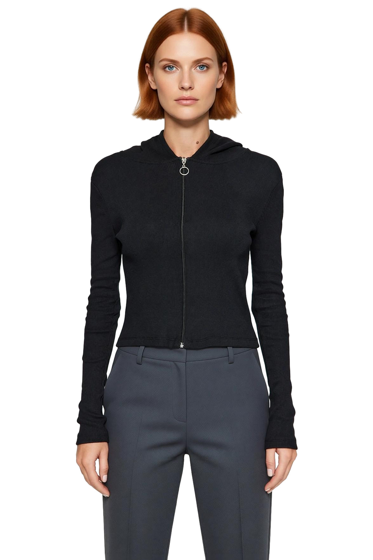 Stil Kadın ve Fermuarlı Fitilli Fitted Vücuda Oturan Esnek Bluz Crop Örme Slim Kalıp Feminen ve zarif detaylarla tasarlanmış bu kadın bluzu, her kadının gardırobunda bulunması gereken kurtarıcı parçalardan biri.