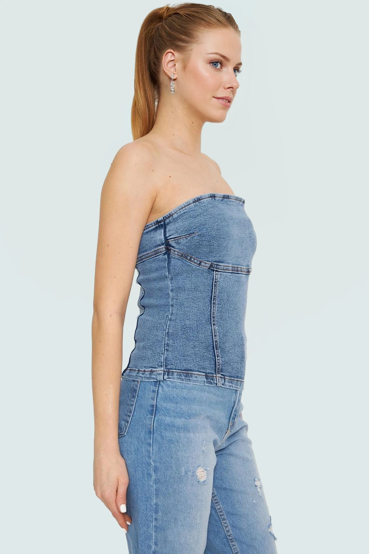 Yazın enerjisini ve rahatlığını yansıtan bu mavi denim bluz, gardrobunuzun vazgeçilmez parçalarından biri olacak. Straplez yaka detayı ile şık ve modern bir görünüm sunarken, fitted kalıbı vücut hatlarınızı zarifçe ortaya koyar. Esnek yapısı sayesinde gün boyu rahat hareket edebilir, kendinizi özgür hissedebilirsiniz.