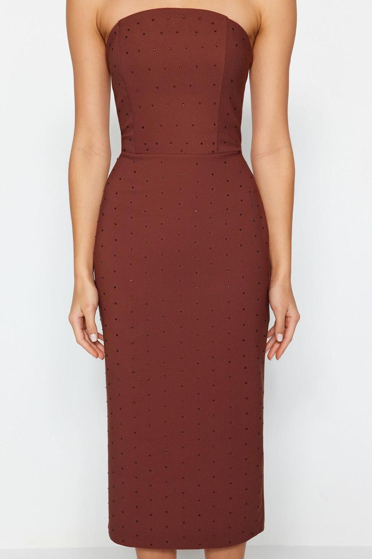Bu zarif ve göz alıcı straplez elbise, özel günlerinizde mükemmel bir görünüm elde etmenizi sağlayacak şekilde tasarlanmıştır. Vücuda oturan kesimi ve midi boyu ile şık ve feminen bir siluet oluşturur. Yüksek kaliteli polyester kumaştan üretilmiş olan elbise, hem rahat hem de dayanıklıdır. Parıldayan taş detayları, elbiseye ekstra bir şıklık ve çekicilik katarak göz kamaştırıcı bir görünüm yaratır. Elbisenin düz deseni ve sade tasarımı, farklı aksesuarlarla kolayca kombinlenebilir ve her tarza uyum sağlar.