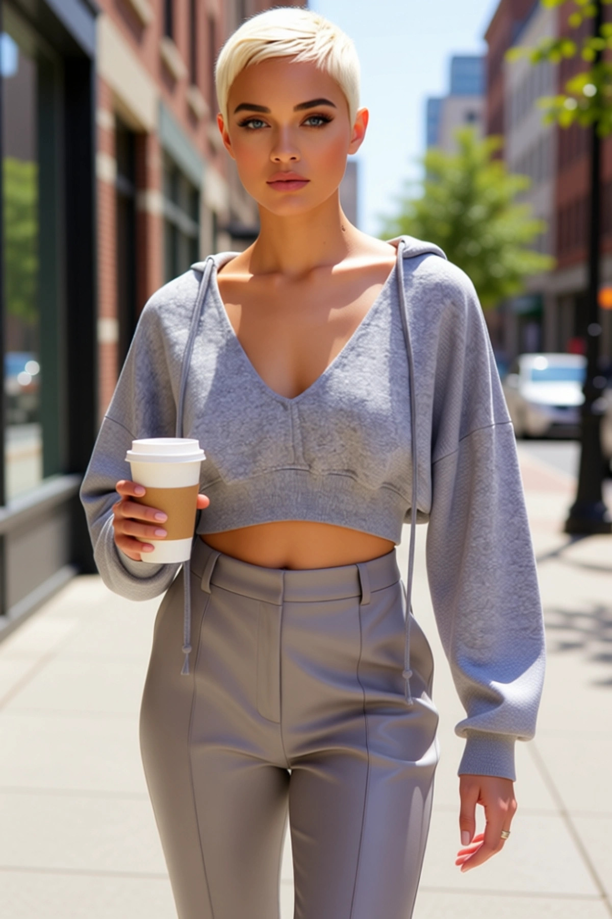 Relaxed Kapüşonlu Düşük Kol Crop Kalın İçi Polarlı V Yaka Rahat Kesim Crop Örme Sweatshirt