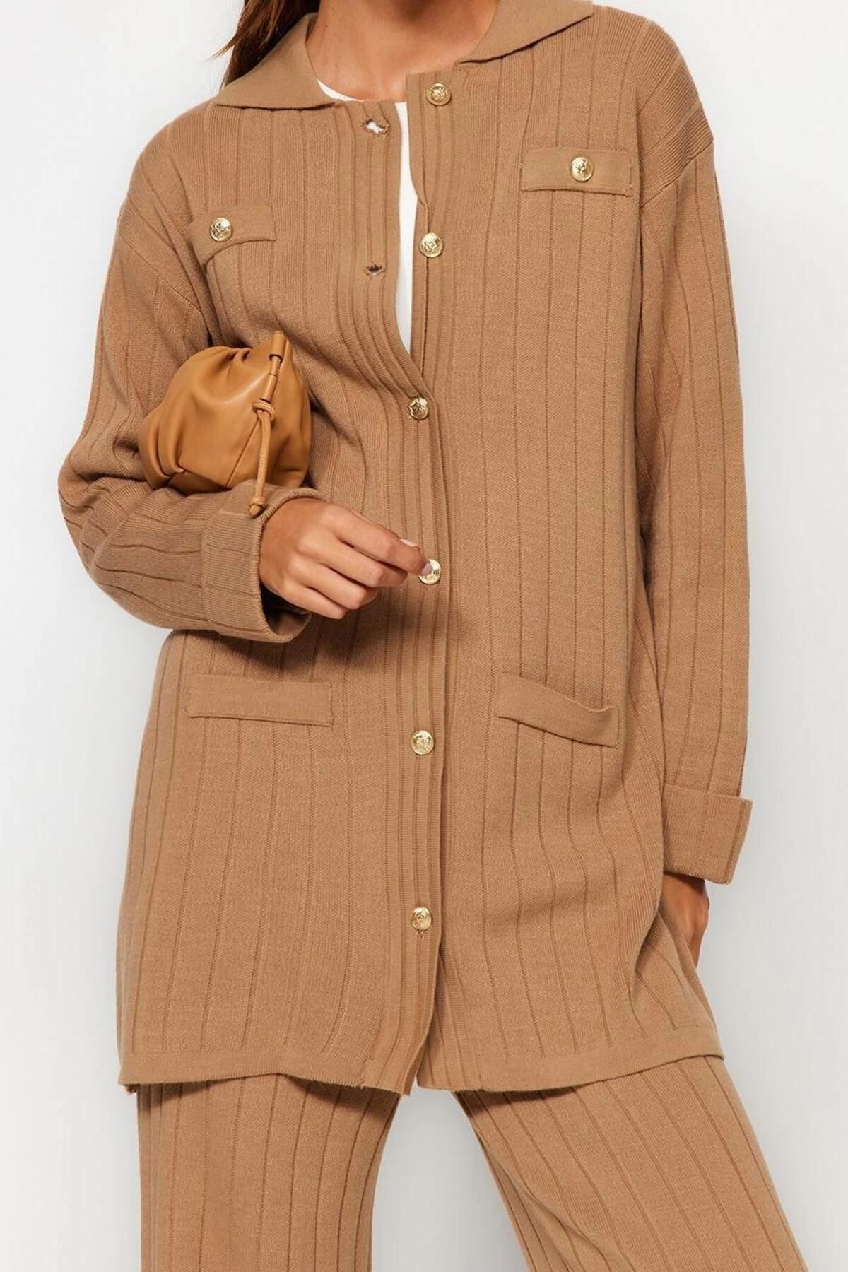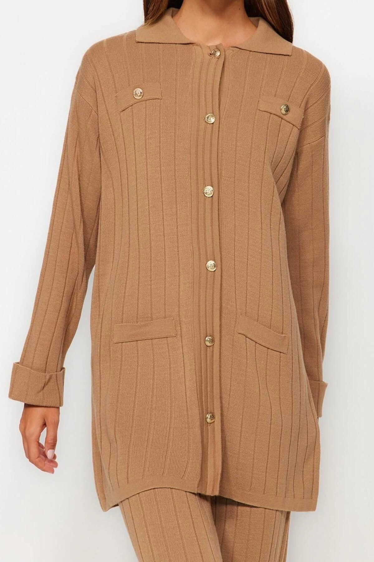 Tarz Kadın Modern Normal Bel Geniş Paça Polo Yaka Fitilli Triko Hırka Kazak-Pantolon Alt-Üst Takım