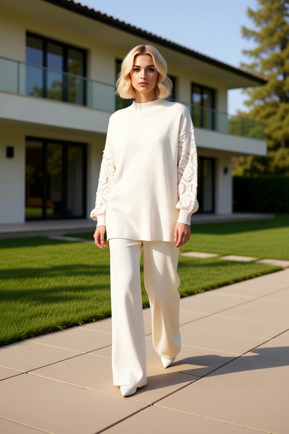 Tarz Kadın Modern Yüksek Bel Geniş Paça Bej Kolları Ajur Örgülü Kazak-Pantolon Triko Takım