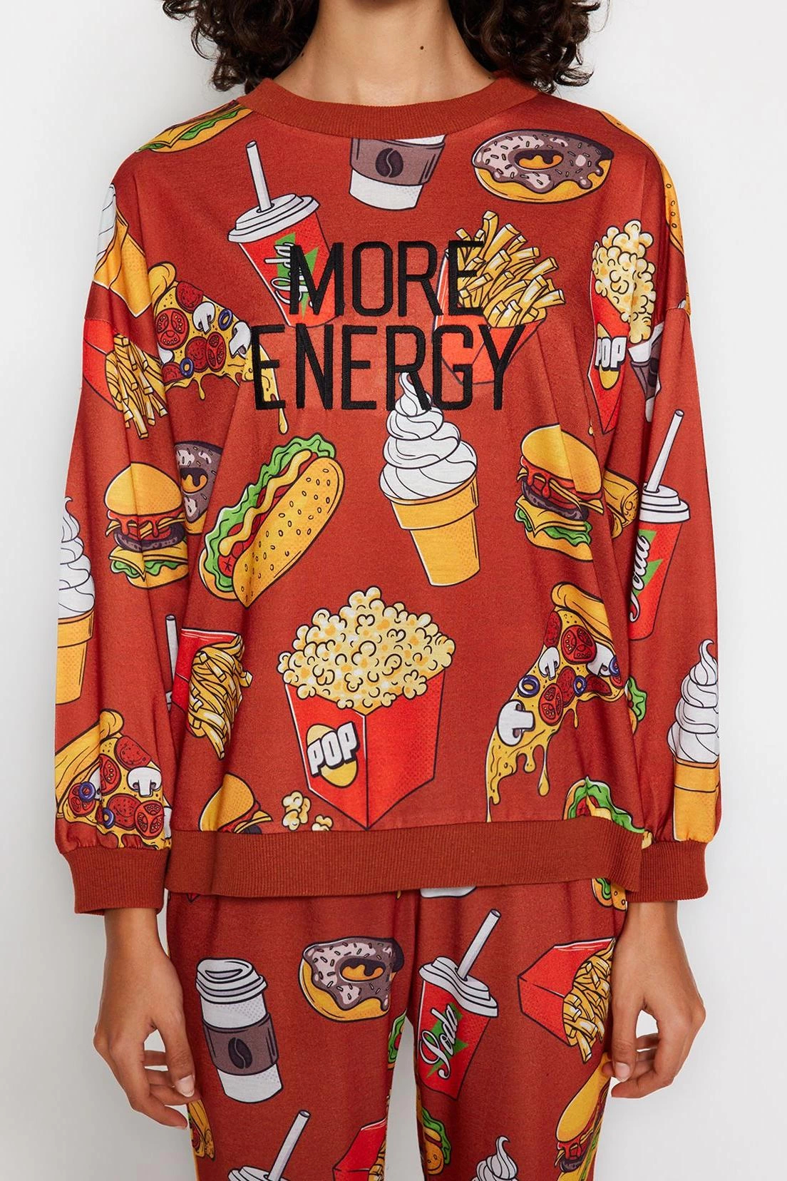 Tarz Rahat Uzun Kollu Boru Paça Nakışlı Desenli Sweatshirt-Jogger Örme Pijama Takımı