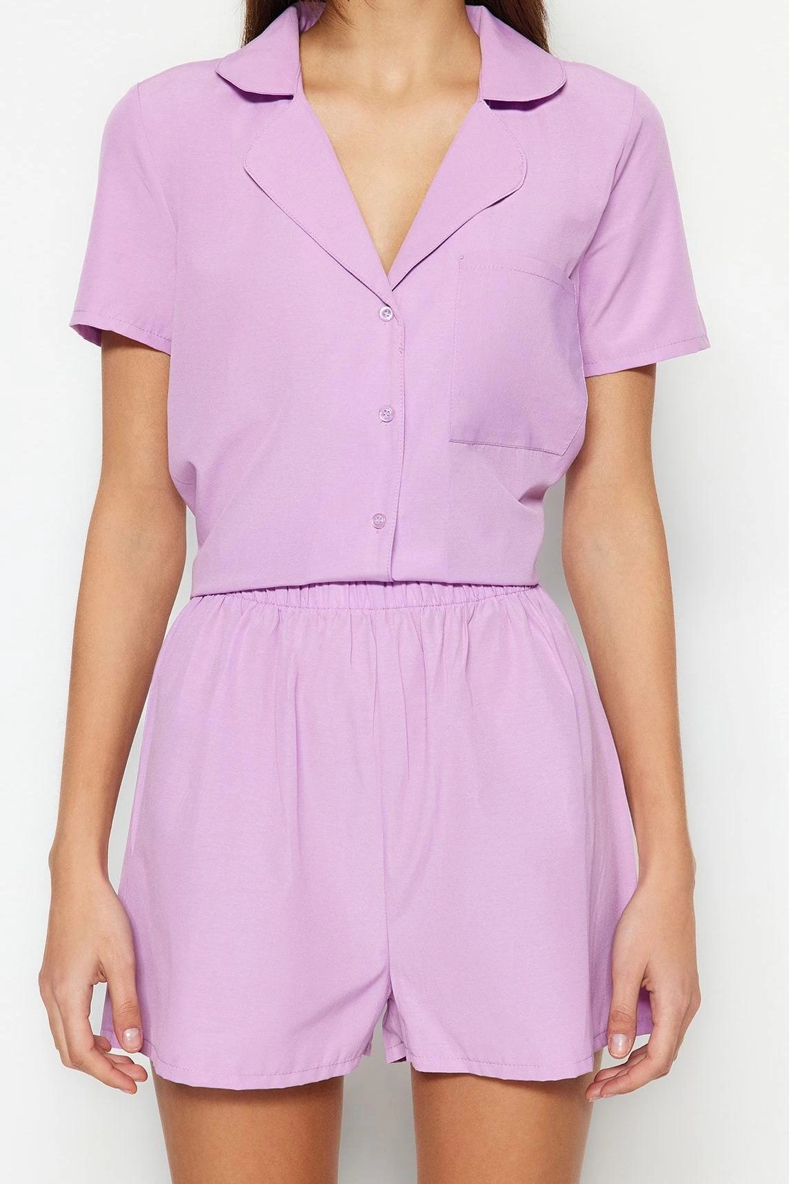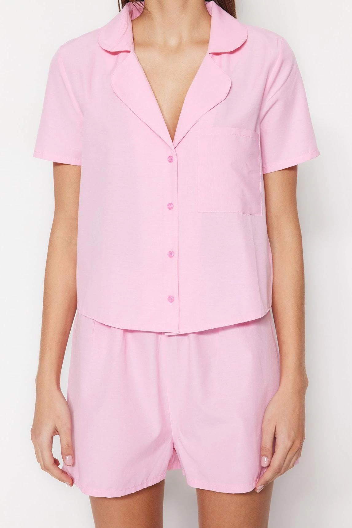 Tarz Rahat Uzun Kollu Boru Paça Terrycotton Gömlek-Şort Dokuma Pijama Takımı