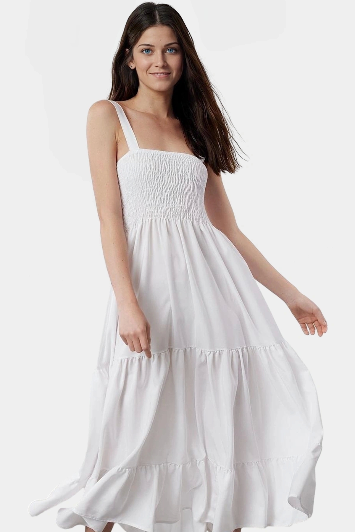 Bu beyaz maxi elbise, yaz aylarının şıklığını ve rahatlığını birleştiriyor. Terrycotton dokuma kumaştan üretilen elbise, yumuşak dokusuyla teninizde adeta eriyor. Gipeli detayı ve skater kalıbıyla hem modern hem de feminen bir görünüm sunuyor. Kare yaka, elbiseye şık bir hava katarken, maxi boyu sizi olduğunuzdan daha uzun ve zarif gösteriyor. İster gündüz aktivitelerinizde, ister akşam davetlerinizde, bu elbiseyle her zaman göz alıcı olabilirsiniz.