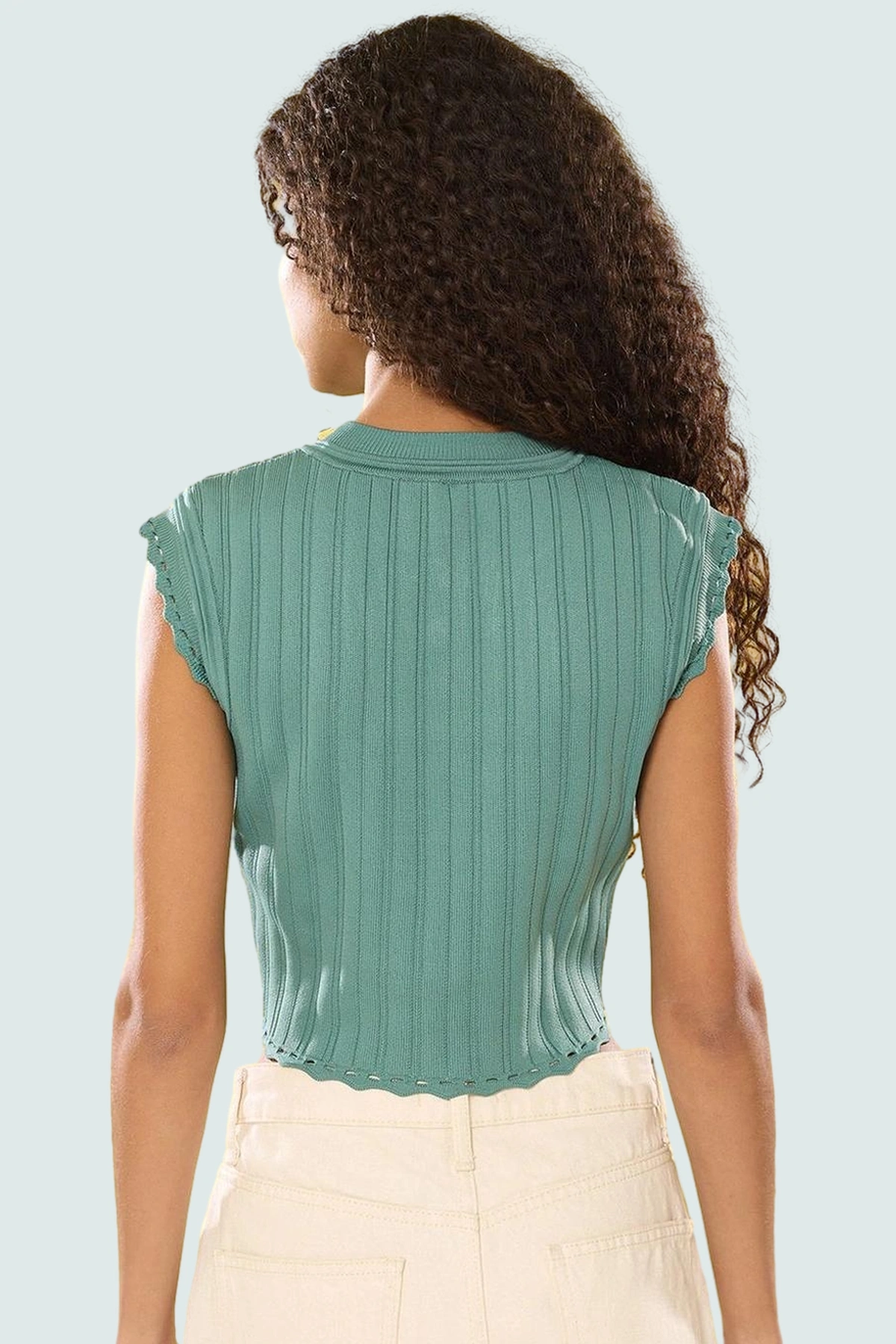 Rahatlığı ve şıklığı bir arada arayanlar için ideal olan bu yeşil crop bluz, yaz aylarında tarzınızı yansıtmanın en kolay yolu! Yüksek kaliteli triko kumaştan üretilen bluz, gün boyu konfor sağlar. Ajurlu detayı, bluza feminen bir hava katarak onu benzersiz kılar. Bisiklet yakası, zarif ve modern bir görünüm sunarken, kolsuz tasarımı sıcak günlerde serin kalmanıza yardımcı olur. Regular kalıp, vücuda mükemmel oturur ve hareket özgürlüğünüzü kısıtlamaz. Crop boyu, her türlü alt giyim ile kolayca kombinlenebilir.