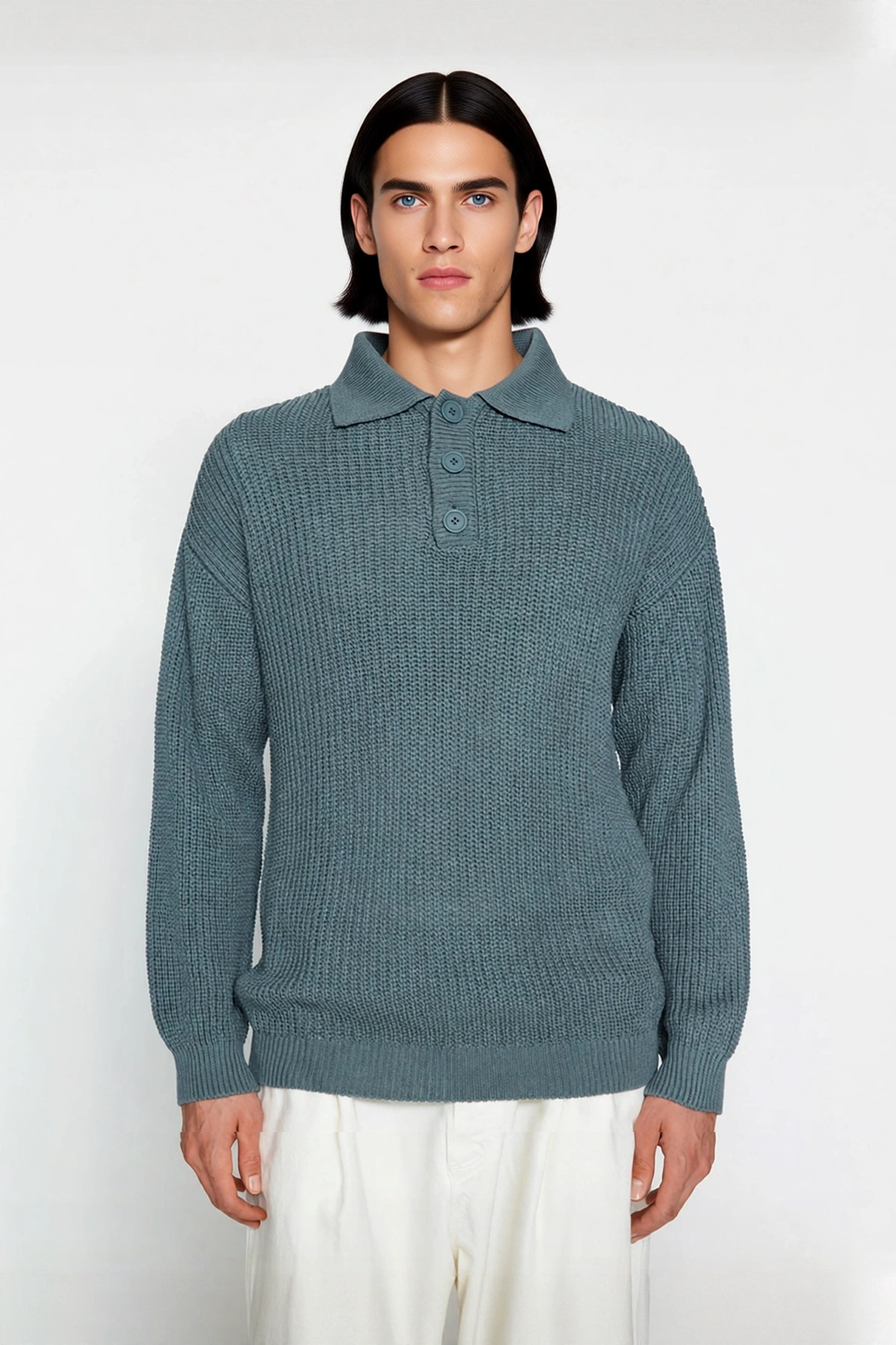 Ürün Özellikleri: Oversize kalıp, akrilik materyal, düz desen, polo yaka, standart kol, triko kumaş, mavi renk, cepsiz tasarım.