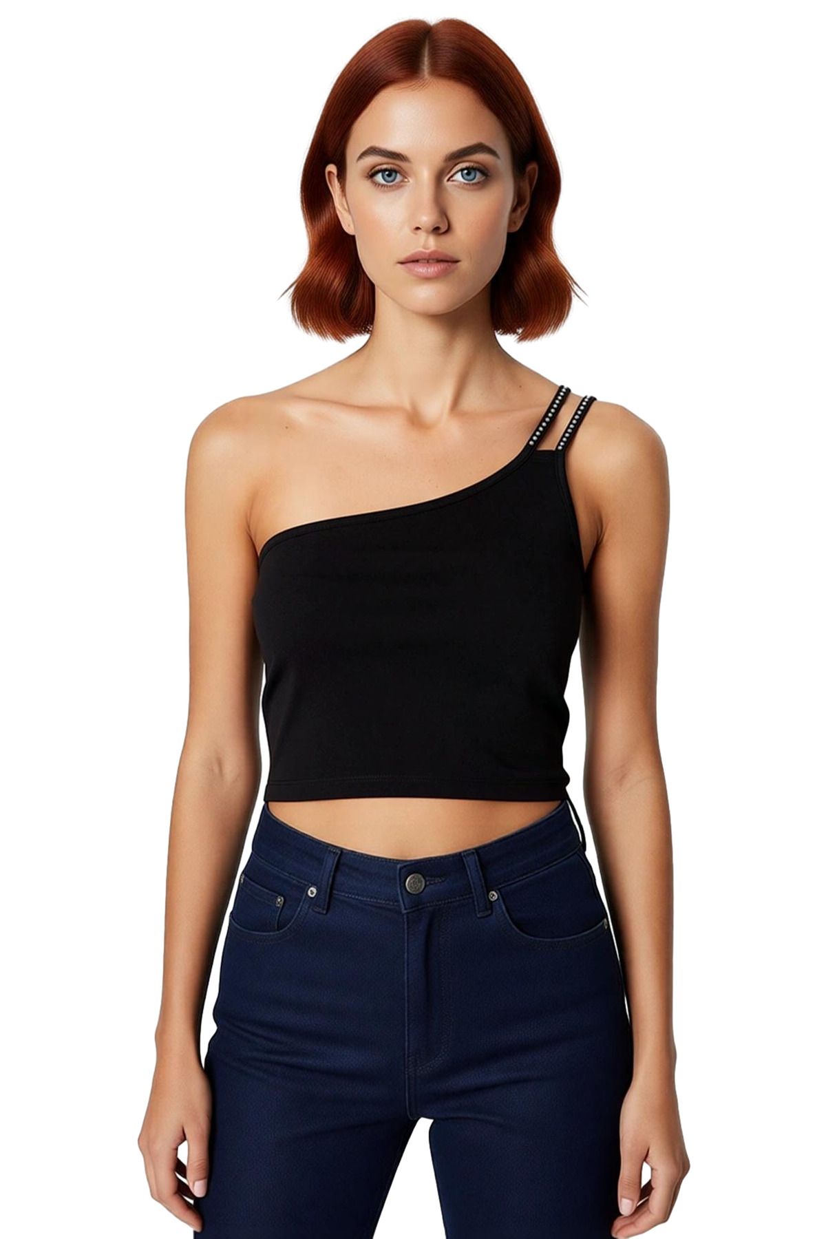 Viskoz Crop Bluz Parlak Taş Detaylı Tek Omuzlu Yazlık Dayanıklı Malzeme Mükemmel Uyum - Görsel 2