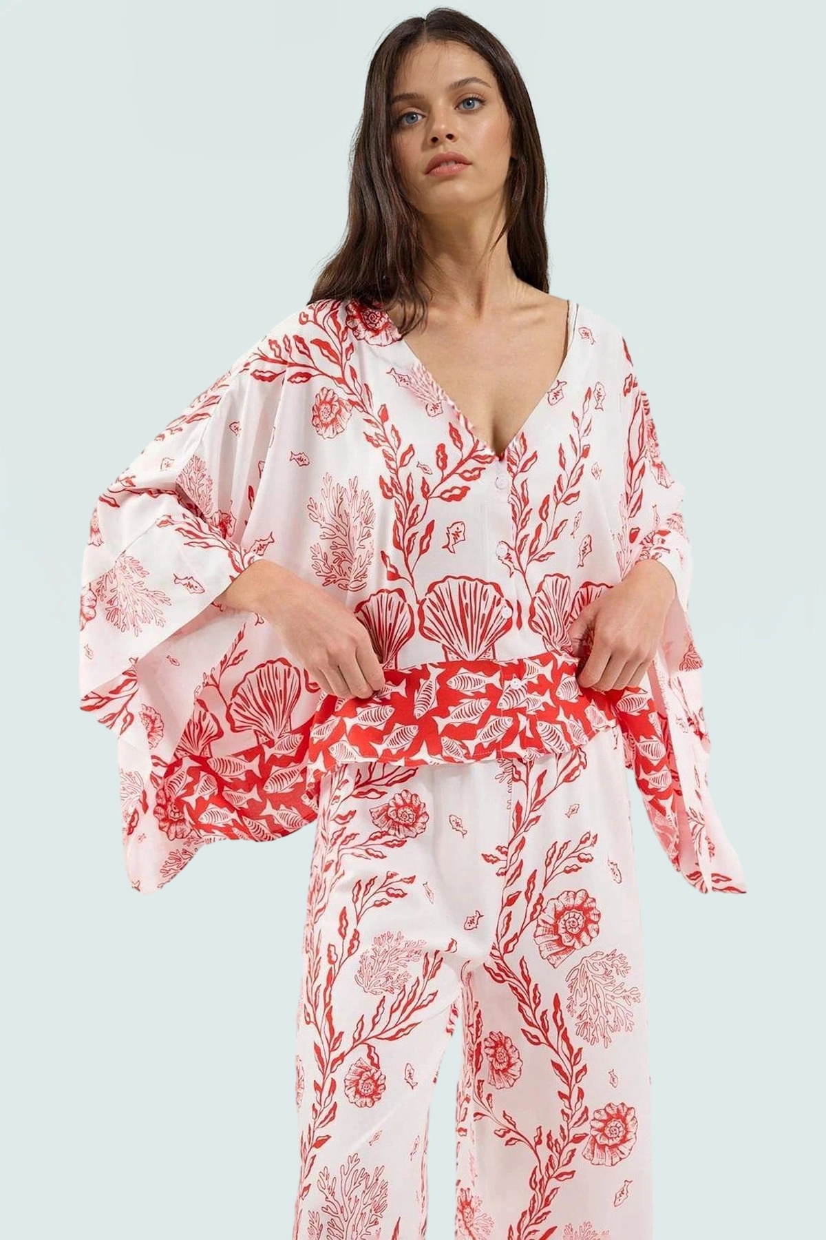 Modelin üzerindeki ürün S-36 bedendir. Modelin ölçüleri: Boy: 177cm Göğüs: 83cm Bel: 63cm Kalça: 92cm. 36-42 beden aralığında sunulan bu takım, farklı vücut tiplerine uyum sağlayarak her bedene mükemmel oturuyor. Plajda bir mayo veya bikini ile kombinleyebileceğiniz gibi, günlük hayatta da şık bir görünüm elde etmek için kullanabilirsiniz.