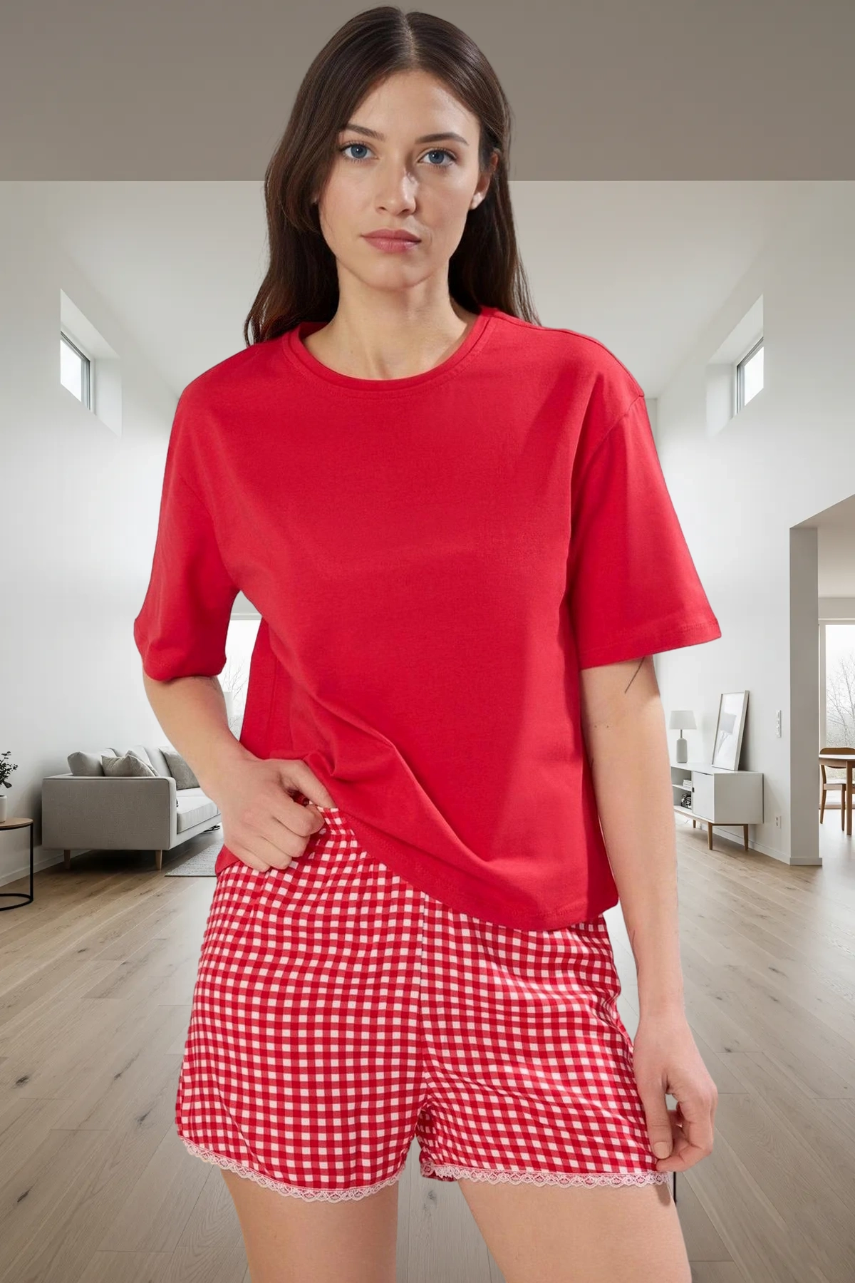 Yüksek kaliteli viskoz kumaş, nefes alabilirliği ve yumuşak dokusuyla gün boyu konfor sağlar. Ekose desen ve dantel detayları, takıma şık bir görünüm kazandırır. Regular kalıp, vücuda mükemmel uyum sağlar ve hareket özgürlüğü sunar. Kısa kollu tişört ve boru paça şort, rahatlığı ön planda tutar.