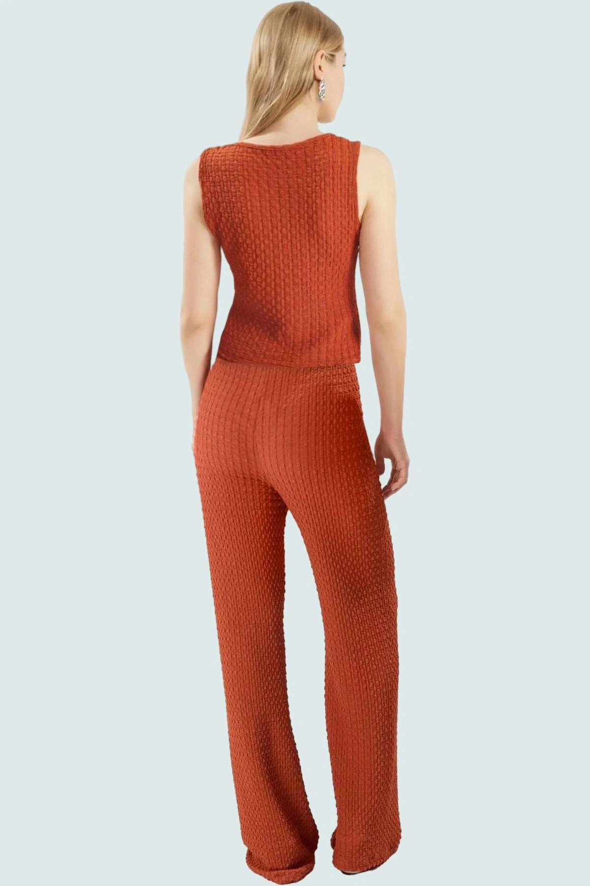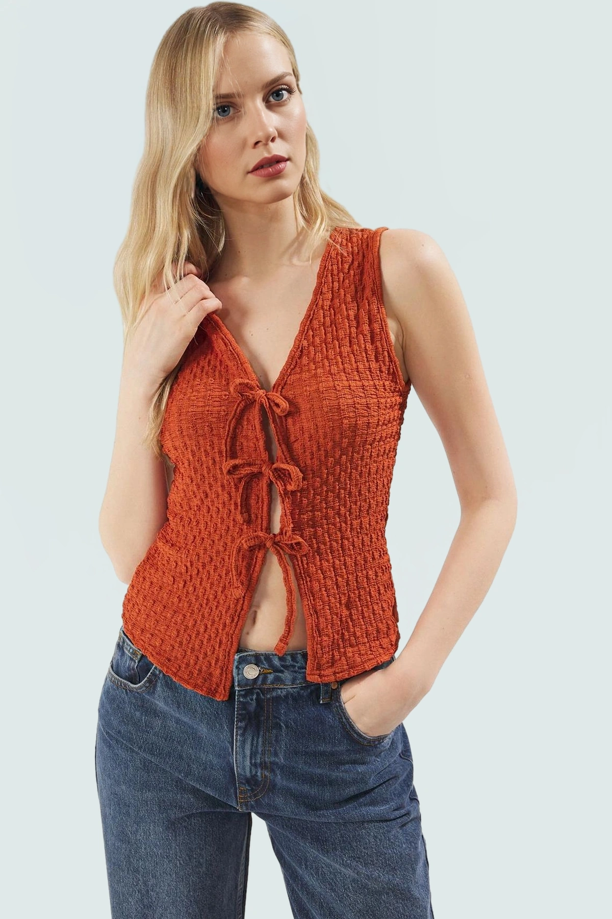 Örme kumaşın hafif ve esnek yapısı sayesinde, hareket kısıtlaması yaşamadan gün boyu rahat bir kullanım sunuyor. V yaka detayı, boynunuzu uzun ve zarif göstererek yüz hatlarınızı daha belirgin hale getiriyor. Ön kısmındaki bağcıklı detay ise bluzu daha da çekici ve özel kılıyor, farklı şekillerde bağlayarak kendi tarzınızı yansıtabilirsiniz. Gofre dokusu ise bluza modern ve şık bir görünüm katıyor. Crop boyu, yüksek belli pantolonlar, etekler ve şortlarla mükemmel bir uyum sağlıyor.