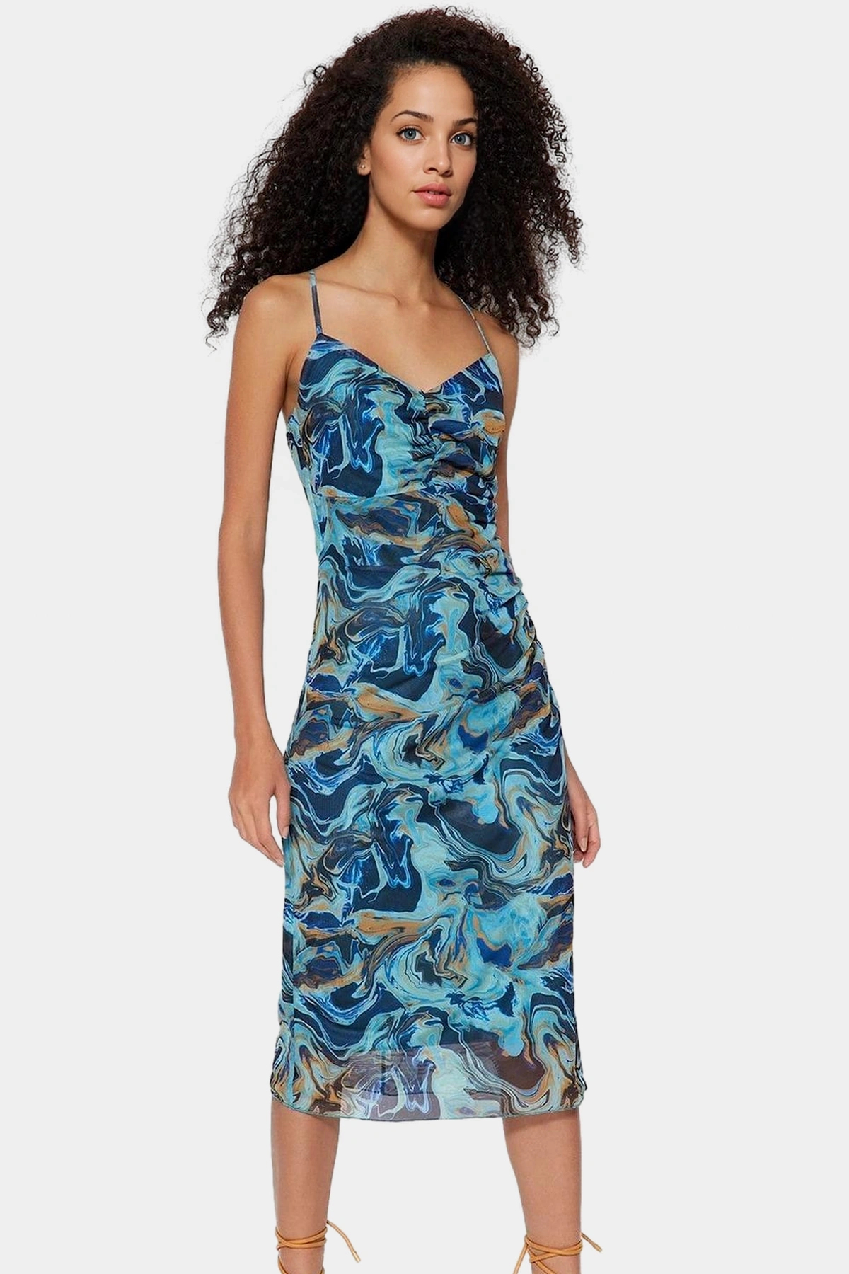 Vücut hatlarınızı mükemmel bir şekilde sergileyen bu mavi elbise, gardırobunuzun yeni favorisi olacak. Yüksek kaliteli örme tül kumaştan üretilen elbise, hem şık hem de konforlu bir deneyim sunuyor. İnce askıları ve midi boyu ile her mevsim kullanabileceğiniz bu elbise, günlük yaşamınızdan özel davetlerinize kadar birçok ortamda rahatlıkla tercih edebilirsiniz.
