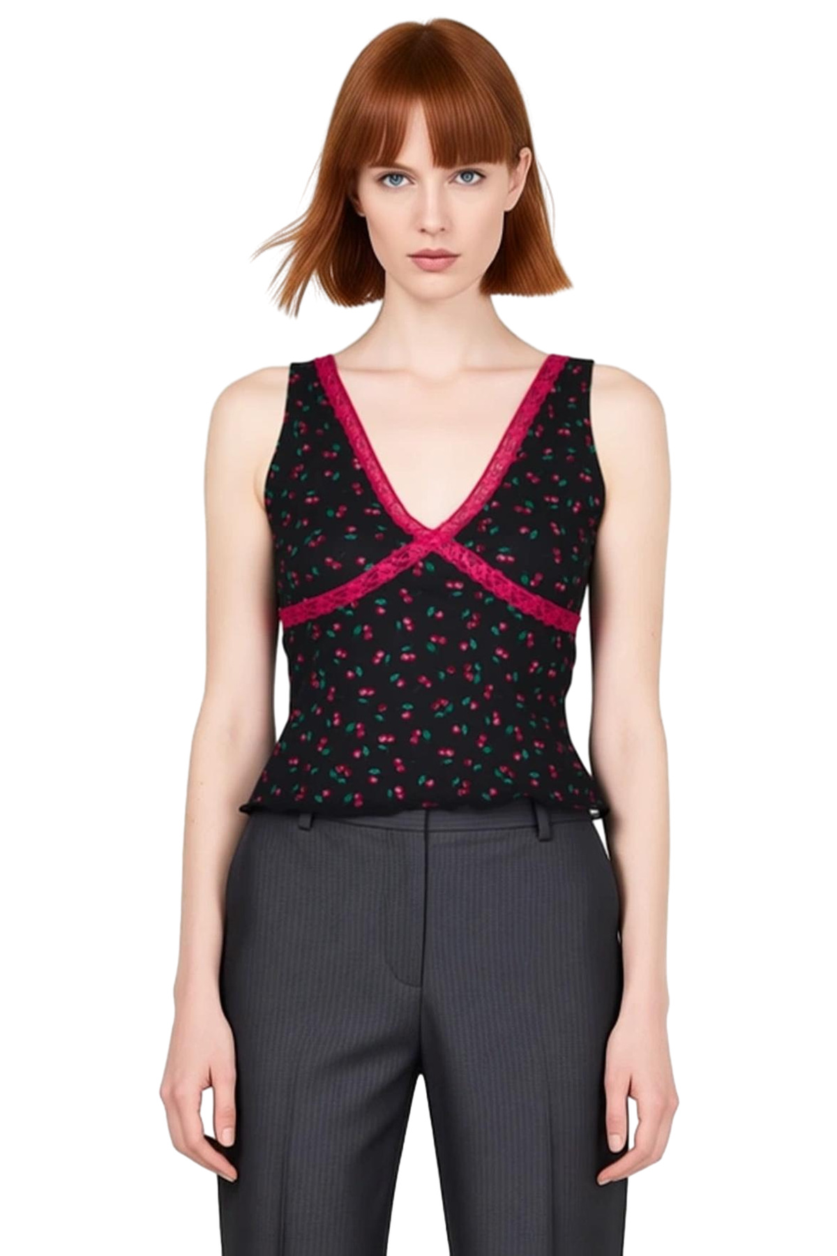 Bu sezonun trendlerinden biri olan siyah tül bluzumuz, şıklığı ve rahatlığıyla dikkat çekiyor. Vücuda oturan kalıbı ve V yakasıyla feminen bir görünüm sunarken, ince tül dokusu ile yaz sıcağında serin kalmanızı sağlıyor. Üzerindeki sevimli kiraz baskısı ise kıyafetinize eğlenceli bir hava katıyor. Polyester ve elastan karışımından üretilen bluzumuz, dayanıklı ve kolay bakımıyla da ön plana çıkıyor.