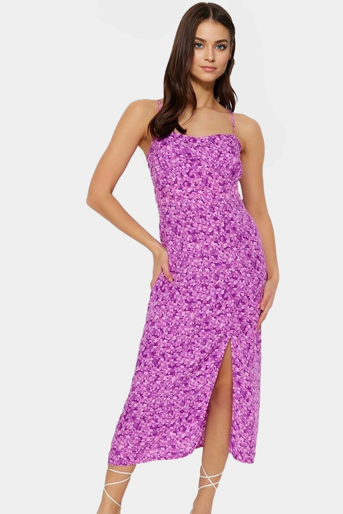 Yaz aylarının enerjisini yansıtan bu lila çiçek desenli elbise, benzersiz tarzınızı ortaya koymanın mükemmel bir yolu. A-line kesimi ve midi boyuyla hem şık hem de rahat bir kullanım sunuyor. Nefes alan dokuma kumaş, gün boyu konforlu bir deneyim yaşatırken, kolsuz tasarımı sıcak havalarda serin kalmanıza yardımcı oluyor. Kare yakası ile modern bir dokunuş katan elbise, her türlü ortamda göz alıcı bir görünüm sağlıyor.