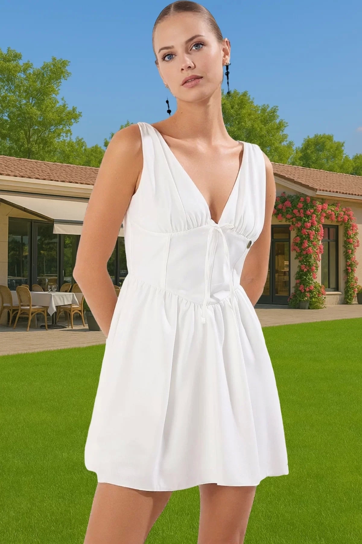 88% polyester ve 12% elastan karışımından üretilen dokuma kumaş, hem dayanıklı hem de yumuşak bir dokuya sahiptir. V yaka detayı, boynu ve omuzları çekici bir şikilde sergilerken, A-kesim kalıp, vüdüdü beden tiplerine uyum sağlar. Astarlı yapısı ise hareket serbestisini engellemeden rahat bir kullanım imkanı sunar. Elbisenin kısa boyu, bacaklarını daha uzun gösterme etkisine sahiptir.