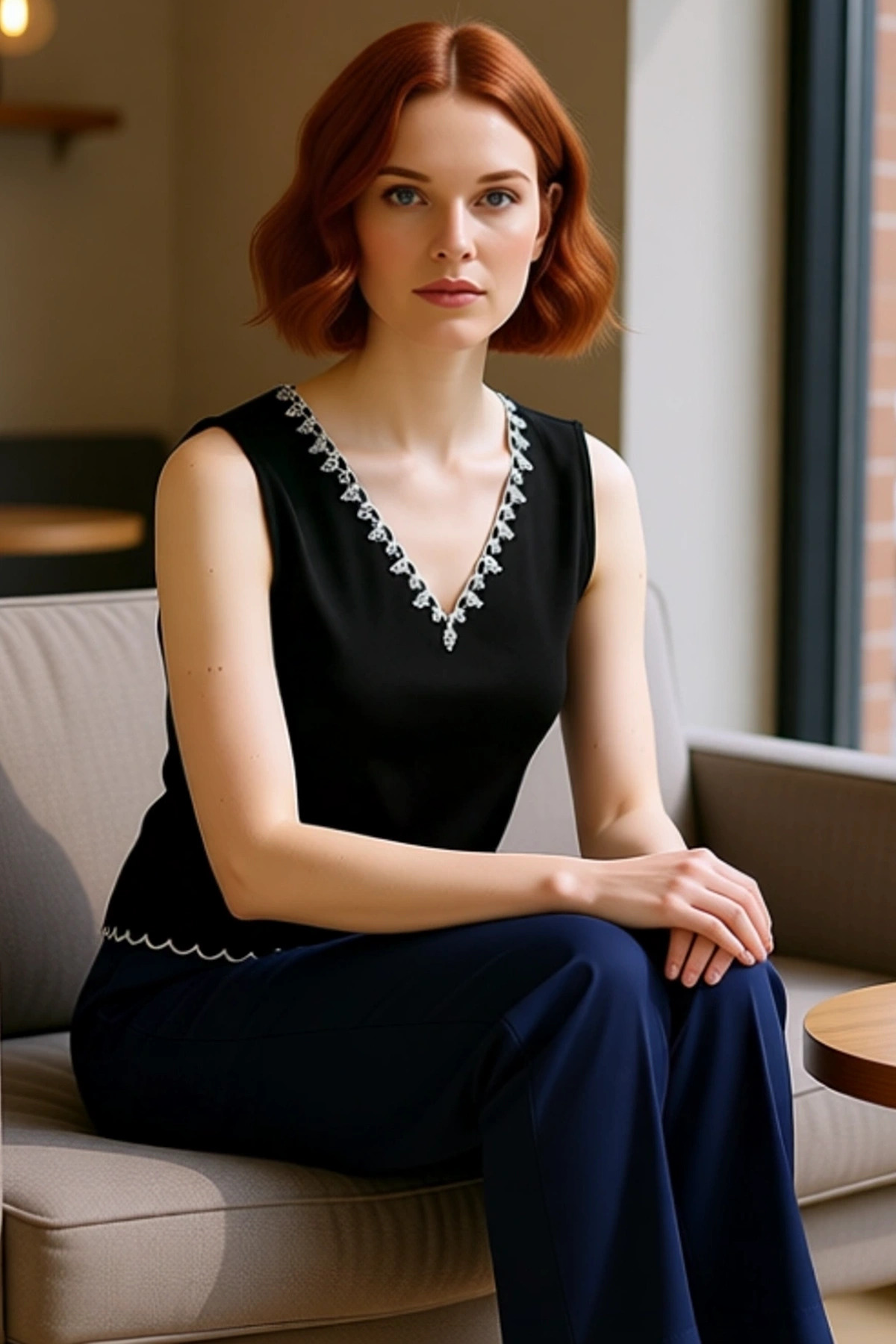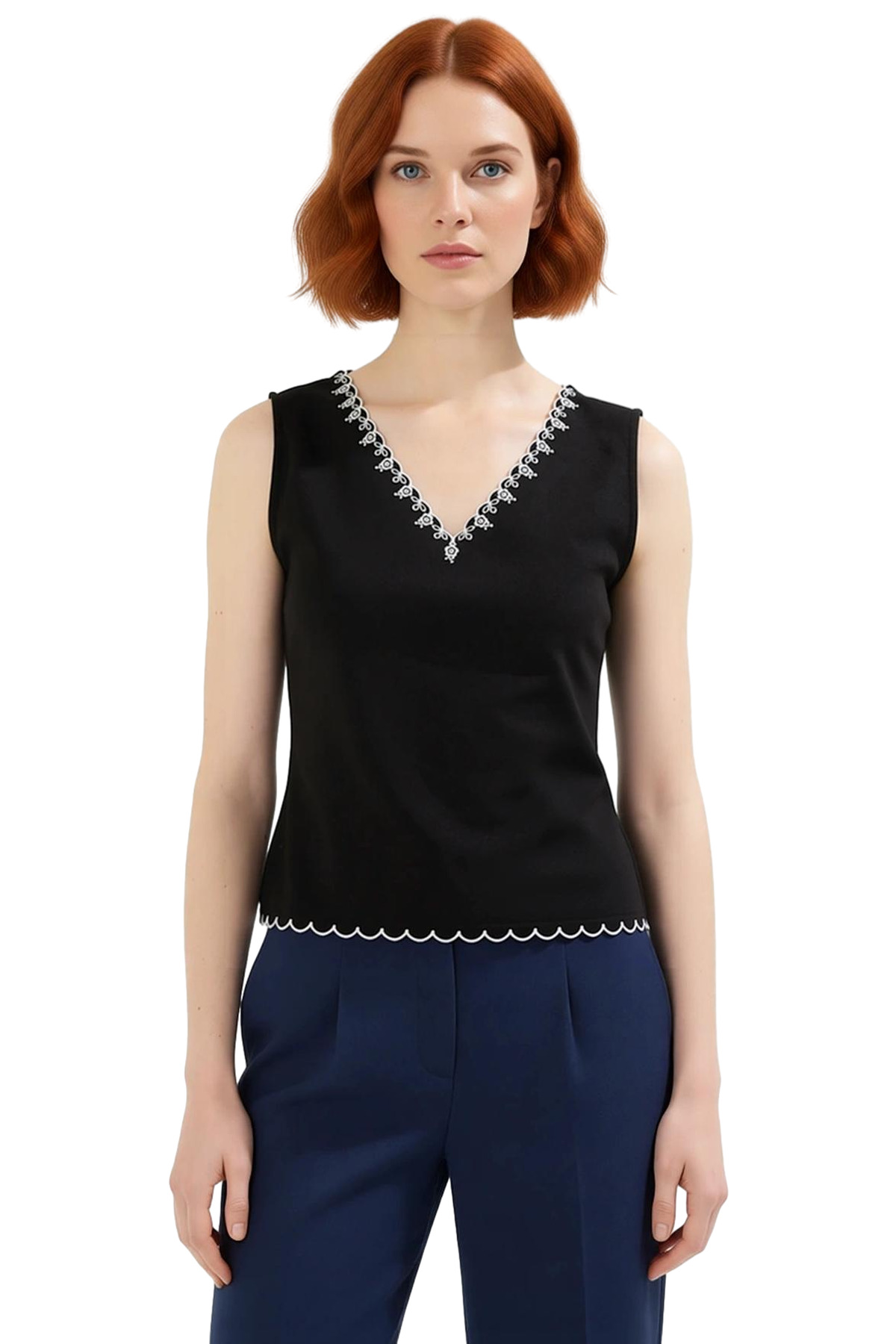 Bu sezonun trendlerinden şık ve rahat bir siyah bluz ile tanışın! V yakası ve fitted kalıbıyla vücudunuzu mükemmel şekilde saran bu bluz, günlük yaşamınızda şıklığı ve konforu bir araya getiriyor. Nefes alabilen scuba krep kumaştan üretilen bluz, %98 polyester ve %2 elastan içeriğiyle gün boyu rahatlık sunuyor. Özenle işlenmiş nakış detayları, bluza zarif bir hava katıyor. Kolsuz tasarımıyla sıcak yaz günlerinde serin kalmanıza yardımcı olurken, regular boyu ile her vücut tipine uyum sağlıyor.