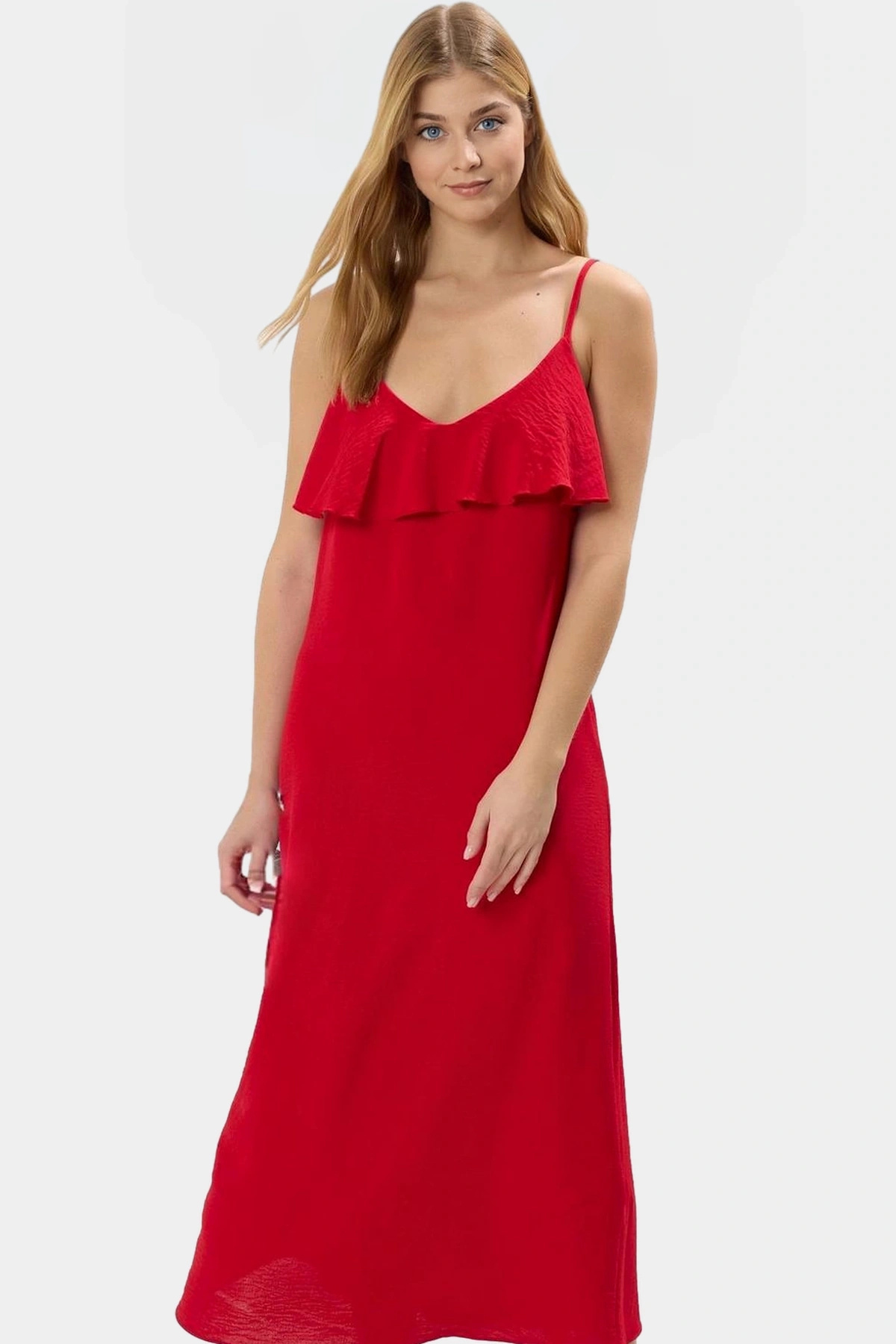 Bu göz alıcı kırmızı elbiseyle yazın tadını çıkarın! 100% polyester dokuma kumaştan üretilen elbise, nefes alabilir yapısıyla gün boyu konfor sunar. V yaka detayı ve şık fırfılları ile feminen ve modern bir tarz yakalayacaksınız. Düz kesimi ve maxi boyu her vücut tipine uyum sağlar. Günlük kullanım için ideal olan bu elbise, plajda, şehirde ve akşam yemeklerinde rahatlıkla tercih edilebilir.