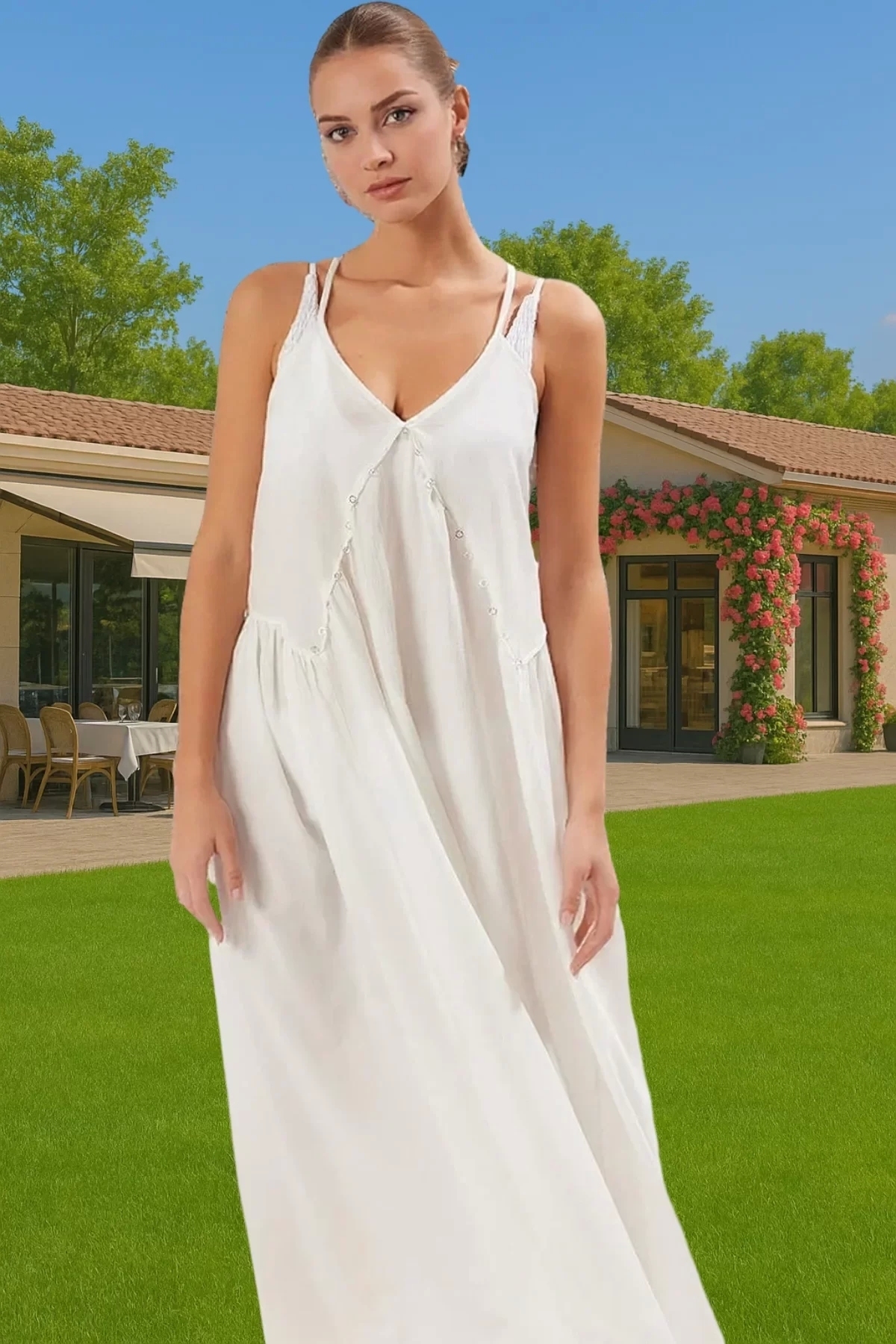 Yaz aylarında şıklıktan ve rahatlıktan şız ödün vermeyenler için tasarlanan bu maxi elbise, plaj stilinizi tamamlamak için ideal bir seçimdir. V yaka tasarımı ile şık bir görünüm sunarken, hafif ve nefes alabilir crinkle dokuma kumaşıyla da gün boyu rahatlık sağlar. Bu elbiseyle kendinizi güzel ve özgür hissedeceksiniz.