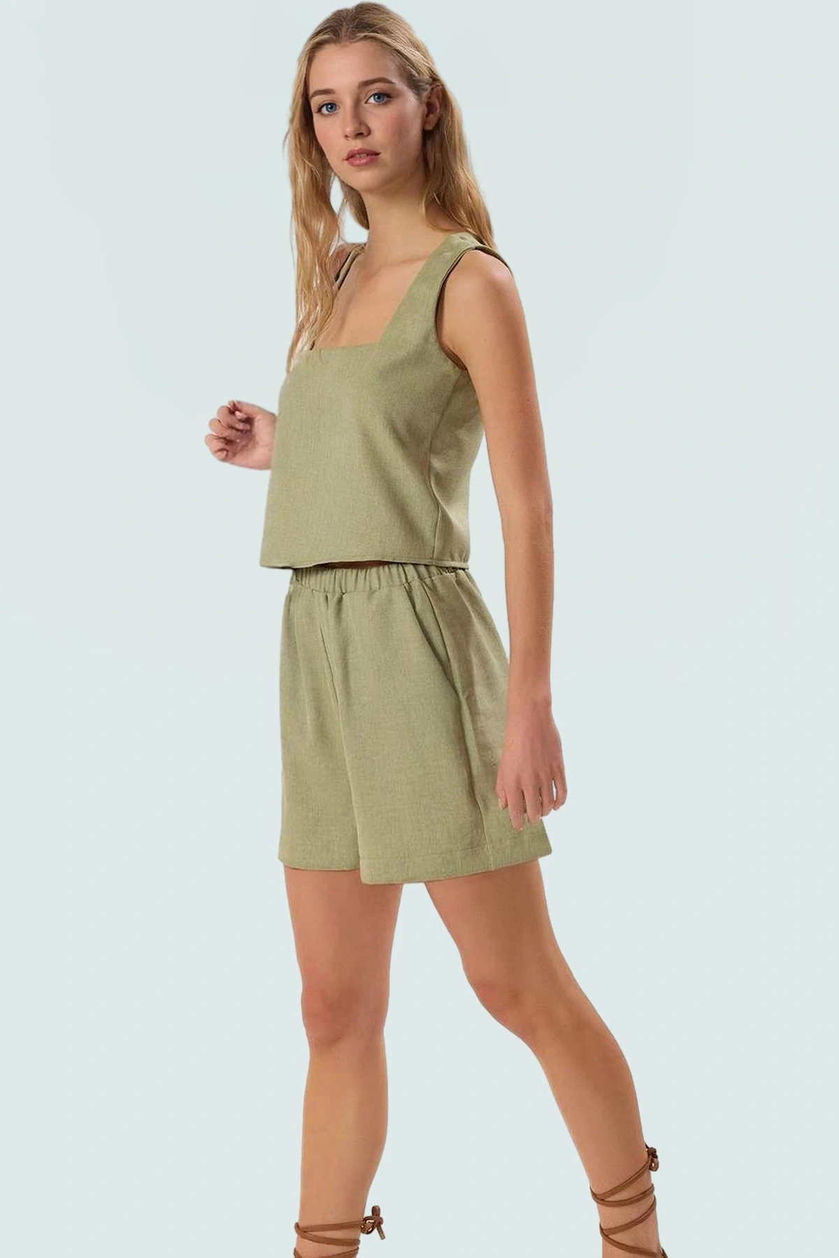 Dokuma kumaş yapısıyla keten görünümünü başarılı bir şekilde taklit eden bu takım, yazın sıcak günlerinde serin kalmanıza yardımcı olur. Kare yaka detayı bluza zarif bir dokunuş katar. Ürün, her vücut tipine uygun rahat bir kalıba sahiptir. Günlük kullanım için ideal olan takım, farklı aksesuarlarla ve ayakkabılarla kolayca kombinlenebilir. Plaj, şehir, akşam yürüyüşü gibi birçok farklı ortamda şıklığınızdan ödün vermeden rahatlığın tadını çıkarabilirsiniz.