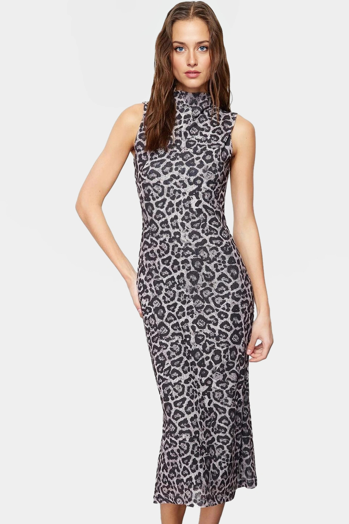 Yazlık Kolsuz Bodycon Kalem Elbise Dik Yaka Leopar Desenli Midi Boy Polyester Zarifane Tasarım