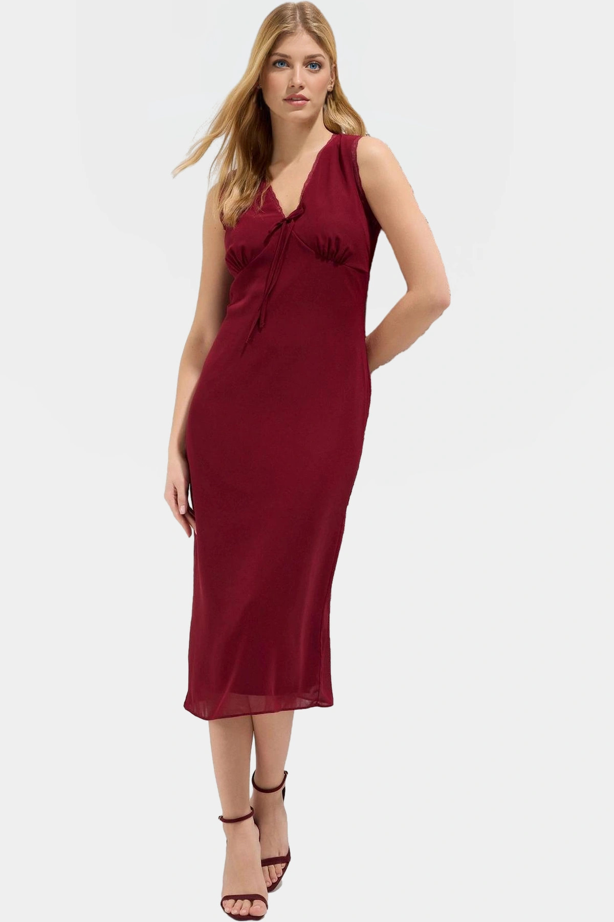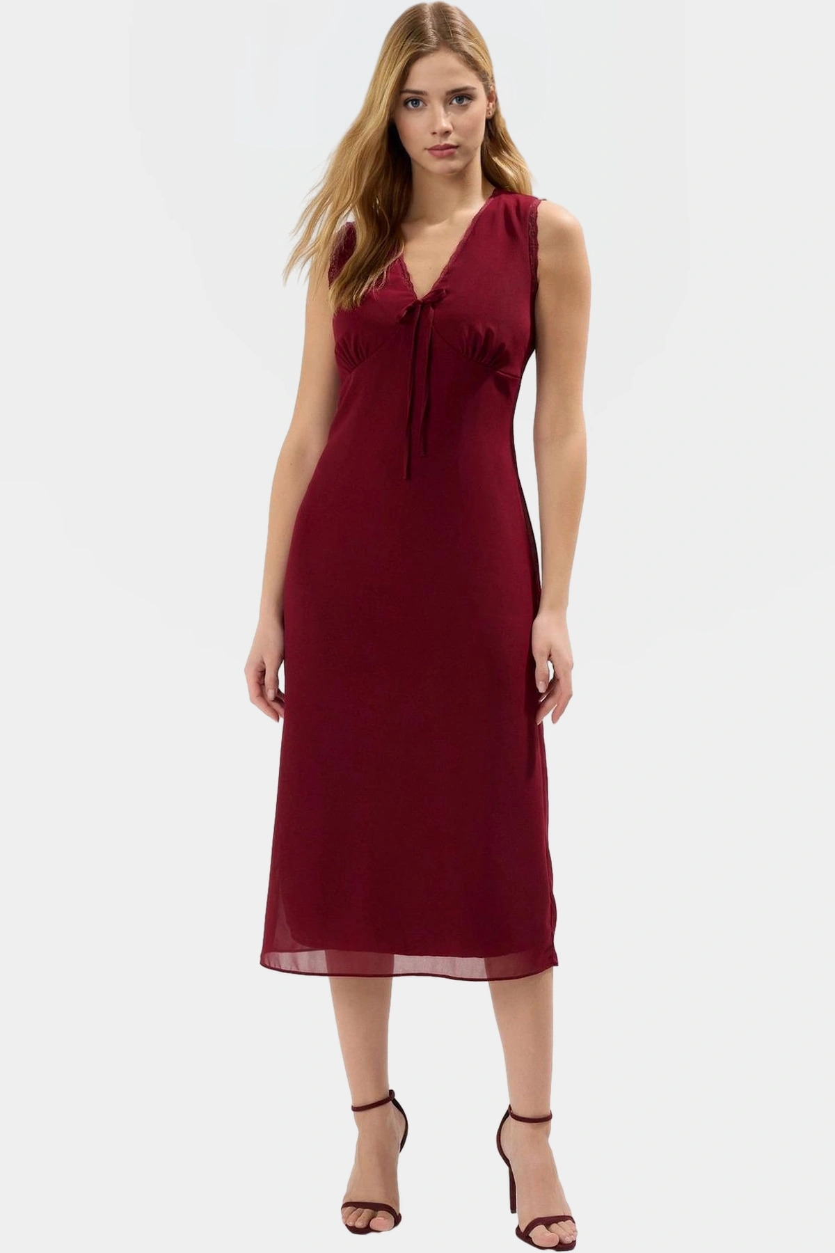 Yaz aylarının sıcak günlerinde hem şık hem de rahat hissetmek isteyenler için ideal bir seçim olan bordo elbisemiz, A kesim kalıbı ve nefes alabilen 100% polyester dokuma kumaşı ile dikkat çekiyor. Kolsuz tasarımı ve ince danteliyle feminen bir görünüm sunarken, midi boyu ile her ortama uyum sağlıyor. Günlük kullanım için olduğu kadar özel günler için de mükemmel bir tercih.