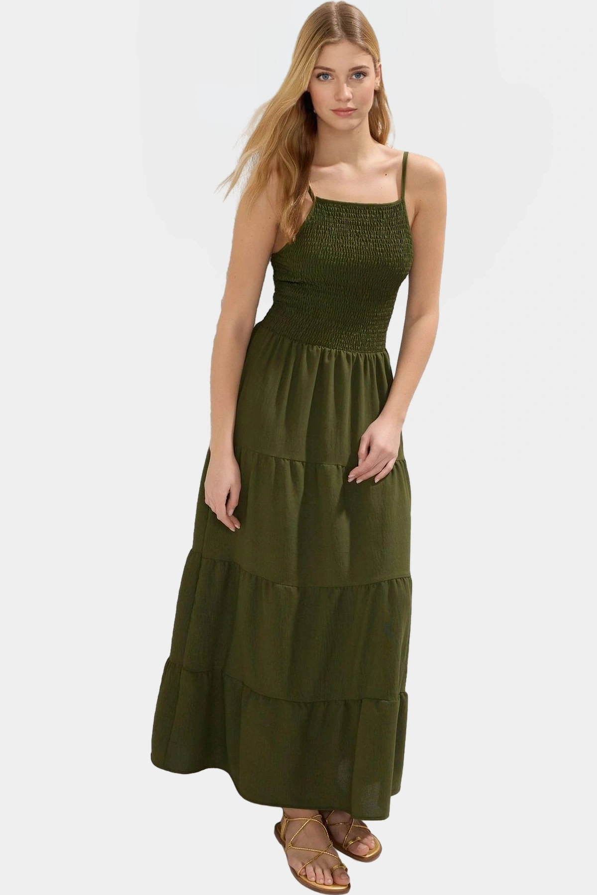 Bu rahat ve şık haki maxi elbise, yaz aylarında günlük kullanım için idealdir. Yumuşak dokuma kumaşı, gün boyu konfor sağlar. Halter yaka tasarımı ve gipeli detayı ile hem modern hem de feminen bir görünüm sunar. Eteğinin belden açılan tasarımı ile hareket kabiliyetinizi kısıtlamaz.