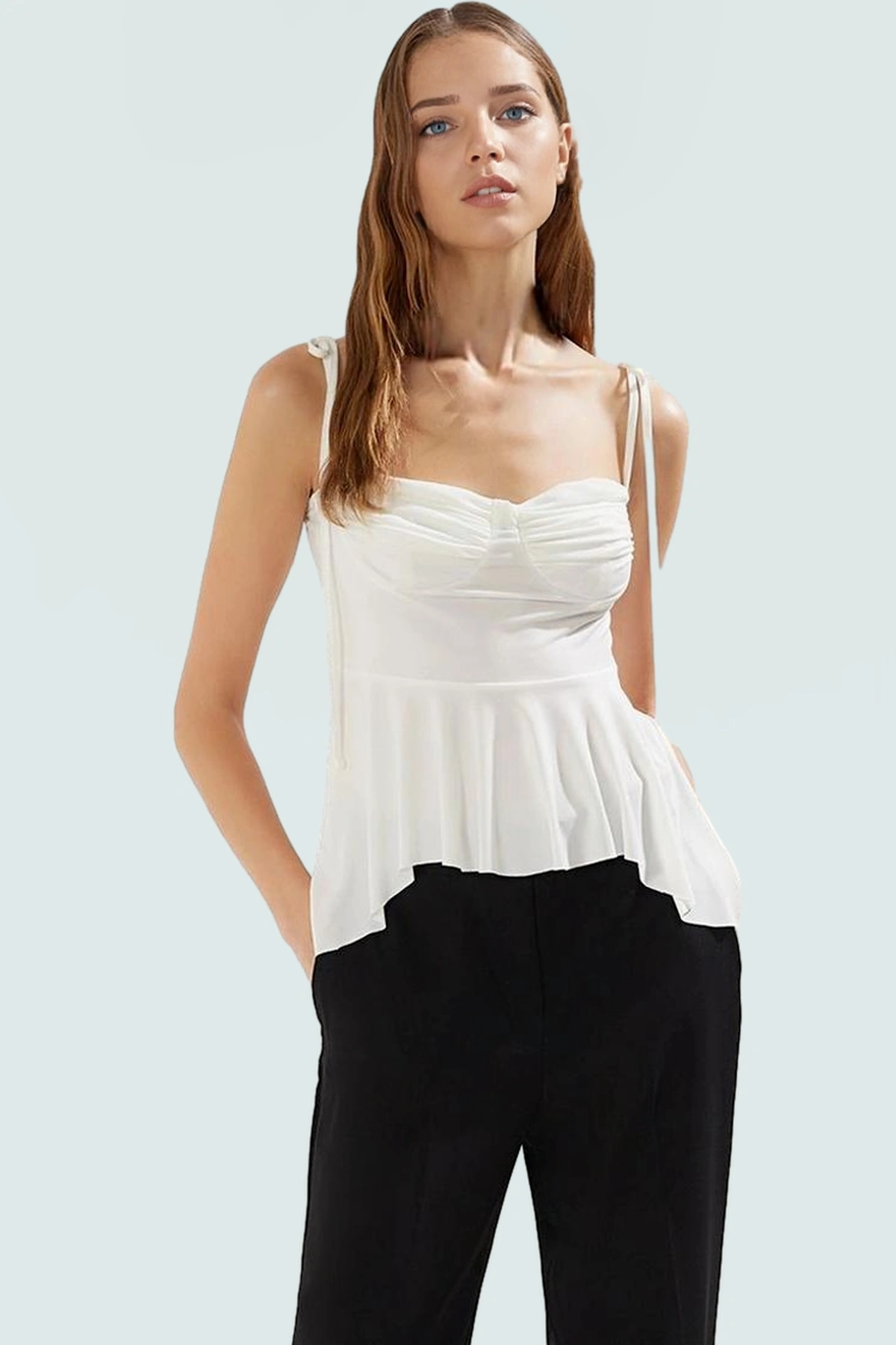 Ürünümüzün ince askıları ve kolsuz tasarımı sıcak yaz günlerinde sizi serin tutarken, kalp yakası ve fiyonklu detaylarıyla feminen ve şık görünmenizi sağlar. Sandy dokuma tipiyle dikkat çeken kumaşı, kolay yıkama ve ütüleme özelliği ile zamandan tasarruf etmenizi sağlar. Fitted kalıbı vücut hatlarınızı zarifçe ortaya koyarken, regular boyuyla rahatlığı ön planda tutar. Bu bluz ile yaz akşamlarınıza özel bir dokunuş katmaya hazır olun.