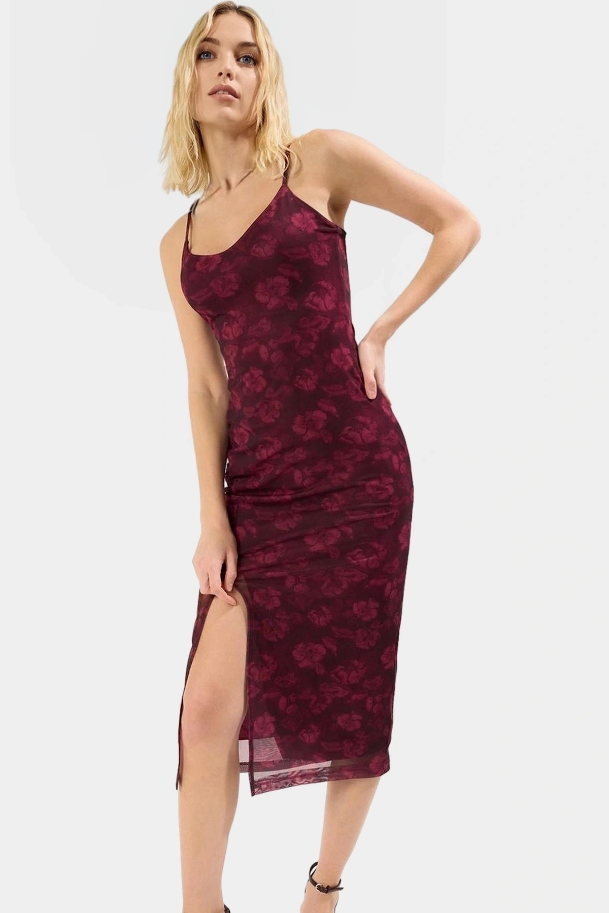 Yaz aylarında şık ve rahatlığı bir arada arayanlar için mükemmel bir seçenek olan bu midi elbise, göz alıcı bordo rengi ve soyut desenleriyle dikkat çekiyor. Vücuda oturan bodycon kesimiyle zarif bir siluet oluştururken, nefes alan tül dokusu gün boyu konfor sağlar. Yüksek kaliteli örme kumaştan üretilen elbise, dayanıklı ve uzun ömürlü kullanım sunar. Yırtmaç detayı, elbiseye hareketlilik ve feminen bir hava katarken, V yaka detayı da şıklığını tamamlar. Astarı sayesinde teninize yapışmaz ve gün boyu rahat hissetmenizi sağlar.