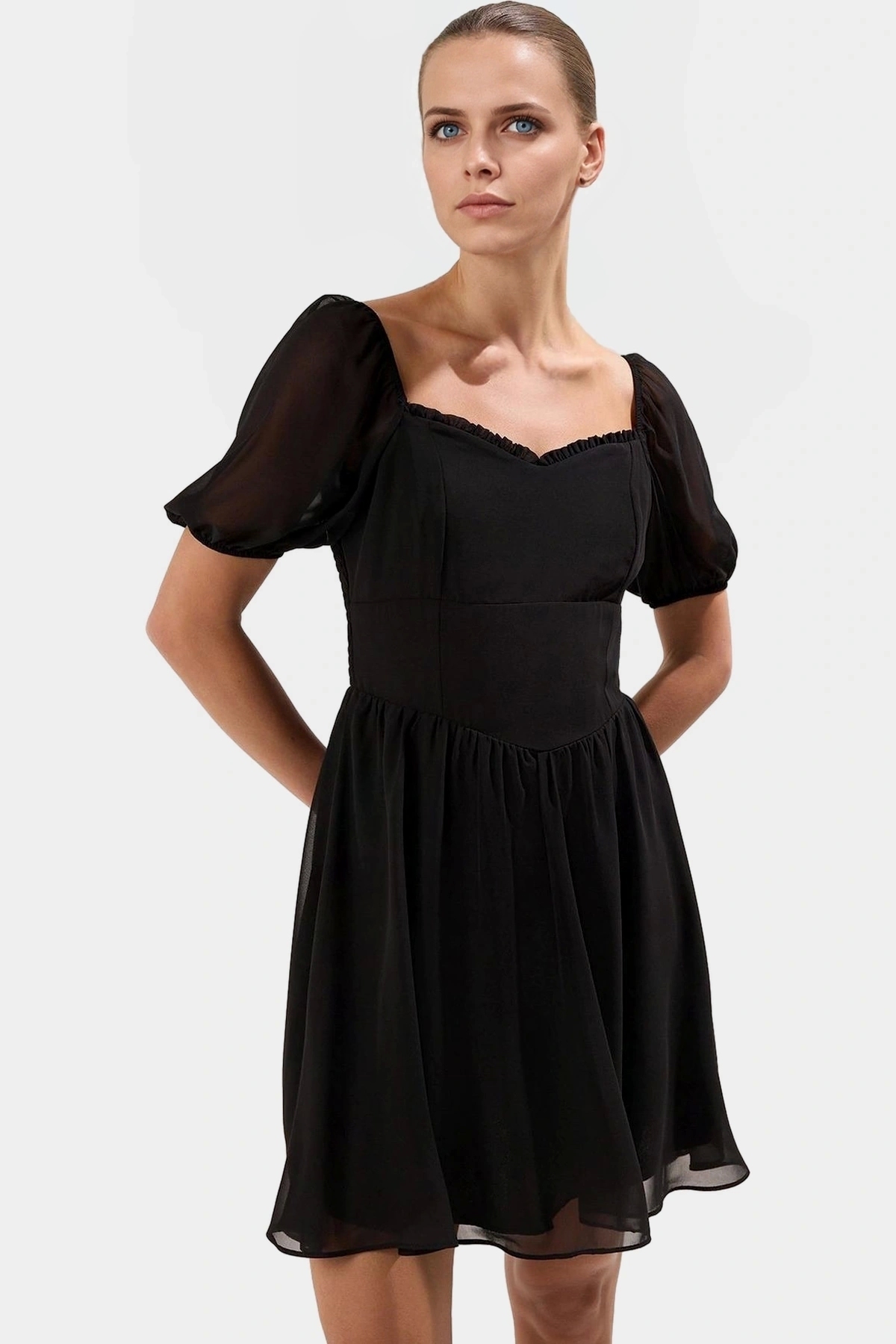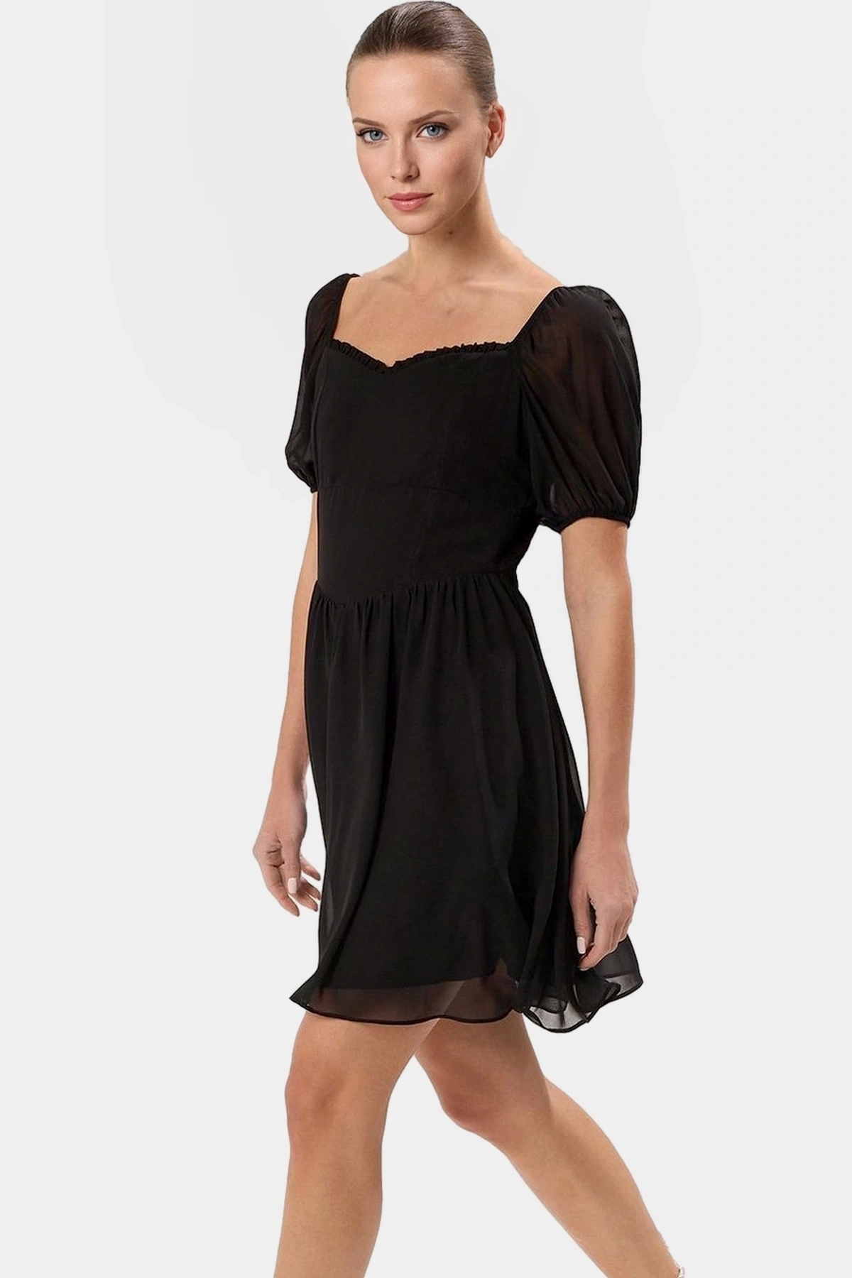 Bu nefes alan şifon mini elbise ile yaz sıcağında bile şıklığınızdan ödün vermeyin! 100% polyester malzemeden üretilen elbise, gün boyu rahatlık ve serinlik sunar. Kalp yaka ve balon kolları feminen bir dokunuş katarak stilinizi tamamlar. Mini boyu ve skater siluetiyle hareket özgürlüğü sağlar. Özellikle yaz akşamları için ideal olan bu elbise, farklı aksesuarlarla kombinlenerek birçok stile uyum sağlar.