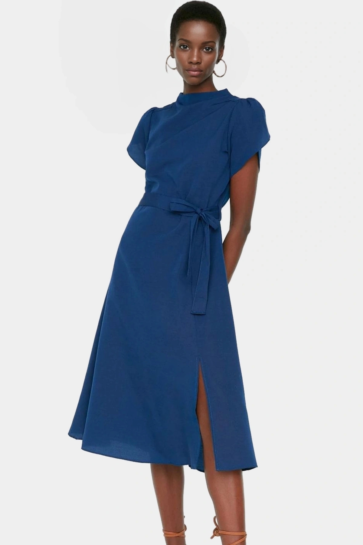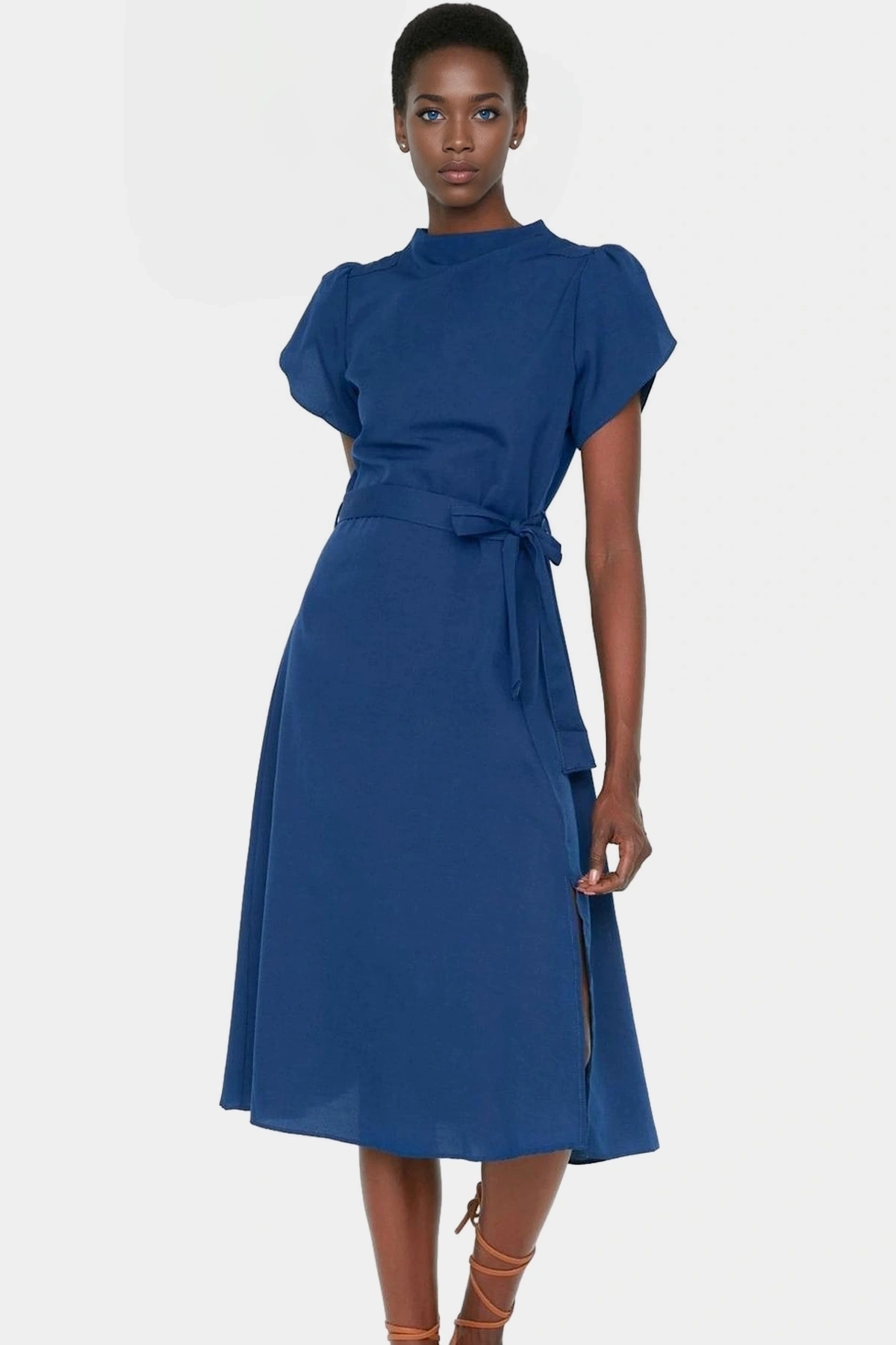 Dokuma kumaş yapısıyla yüksek kalite ve dayanıklılığı bir araya getiren elbise, cepsiz tasarımıyla minimalist bir şıklık sunuyor. 120 cm ön boyuyla midi boy bir elbise olan bu model, hem iş hayatında hem de günlük aktivitelerinizde şık görünmenizi sağlar. Lacivert rengi, yazlık kombinlerinizi tamamlamanız için ideal bir renk seçeneğidir.