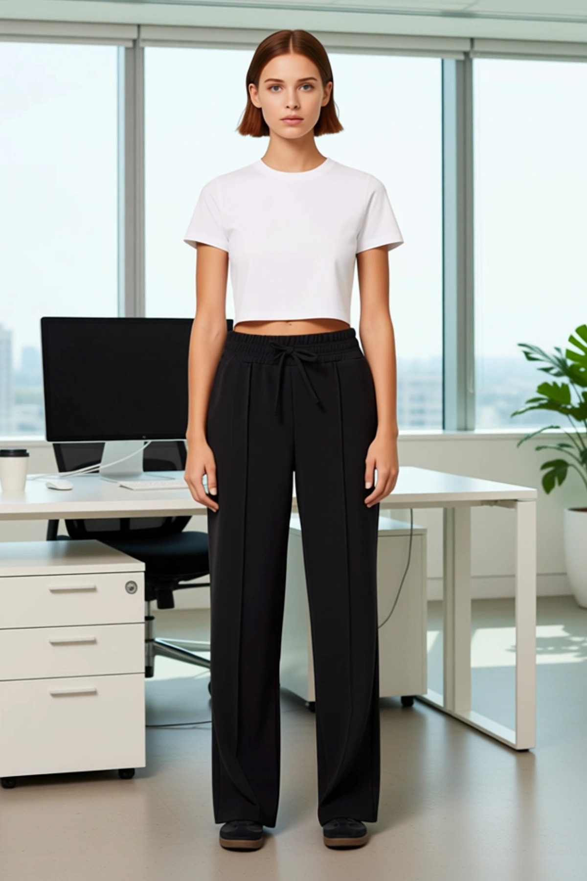 Modern ve zarif bir görünüm sunan bu siyah pantolon, her kadının gardırobunda bulunması gereken bir parça. Yüksek bel ve düz kesim kalıbı, vücudu kusursuzca sararak şık bir siluet oluşturur. Geniş paça detayı, hareket özgürlüğü sağlarken aynı zamanda güncel moda akımlarına uygun bir stil sunar. Pantolonun bel kısmındaki kalın lastik ve bağcık detayı, hem rahat bir kullanım sunar hem de tasarıma sportif bir dokunuş katar. Düz deseni sayesinde, farklı renk ve desenlerdeki üst giyim ürünleriyle kolayca kombinlenebilir. %97 polyester ve %3 elastan içeren örme kumaşı, dayanıklılığı ve esnekliği bir arada sunarak gün boyu konfor sağlar. Bu pantolon, casual ve smart görünümler için idealdir, dinamik ve stil sahibi bir duruş sergilemenize olanak tanır. Bu pantolonun yüksek bel özelliği, karın bölgesini toparlayarak daha ince bir görünüm kazandırır. Düz kesim paçalar, bacak boyunu daha uzun gösterir ve zarif bir akış sağlar. Nervürlü dikişler, pantolonun ön kısmında belirginleşerek tasarıma ekstra bir detay katmaktadır. Elastan oranı, pantolonun vücuda uyumunu artırır ve hareket ederken maksimum konfor sunar. Bu özellikler, pantolonu hem günlük kullanımda hem de daha şık davetlerde tercih edilebilir kılar. Kumaşın dokuma tipi olan scuba krep, pantolona hem şık bir parlaklık hem de iyi bir döküm kazandırarak genel görünümünü zenginleştirir. Bu pantolon, hem rahatlığı hem de şıklığı bir arada arayan kadınlar için mükemmel bir seçenektir. Bu siyah örme pantolon, özellikle sonbahar ve kış mevsimlerinde rahatlıkla kullanılabilir. Kombin önerisi olarak, üzerine basic bir kazak veya şık bir gömlek giyerek smart casual bir stil oluşturabilirsiniz. Ayakkabı olarak, spor ayakkabılar, mokasenler veya topuklu çizmeler ile tamamlayabilirsiniz. Bu pantolon, eteklerin yerine geçerek gardırobunuza farklı bir alternatif sunar. Bakımı oldukça kolaydır; nazikçe elde yıkanabilir veya düşük devirde makinede yıkanabilir, bu da ürünün ömrünü uzatır.