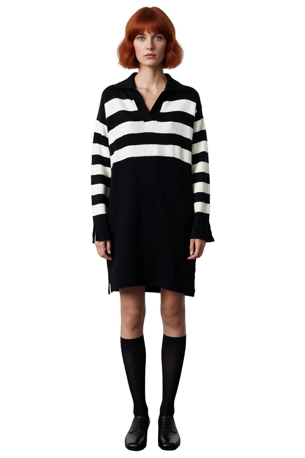 Ürün Özellikleri: Shift kalıp, akrilik materyal, çizgili desen, polo yaka, standart kol, triko kumaş, siyah renk, cepsiz, astarsız.