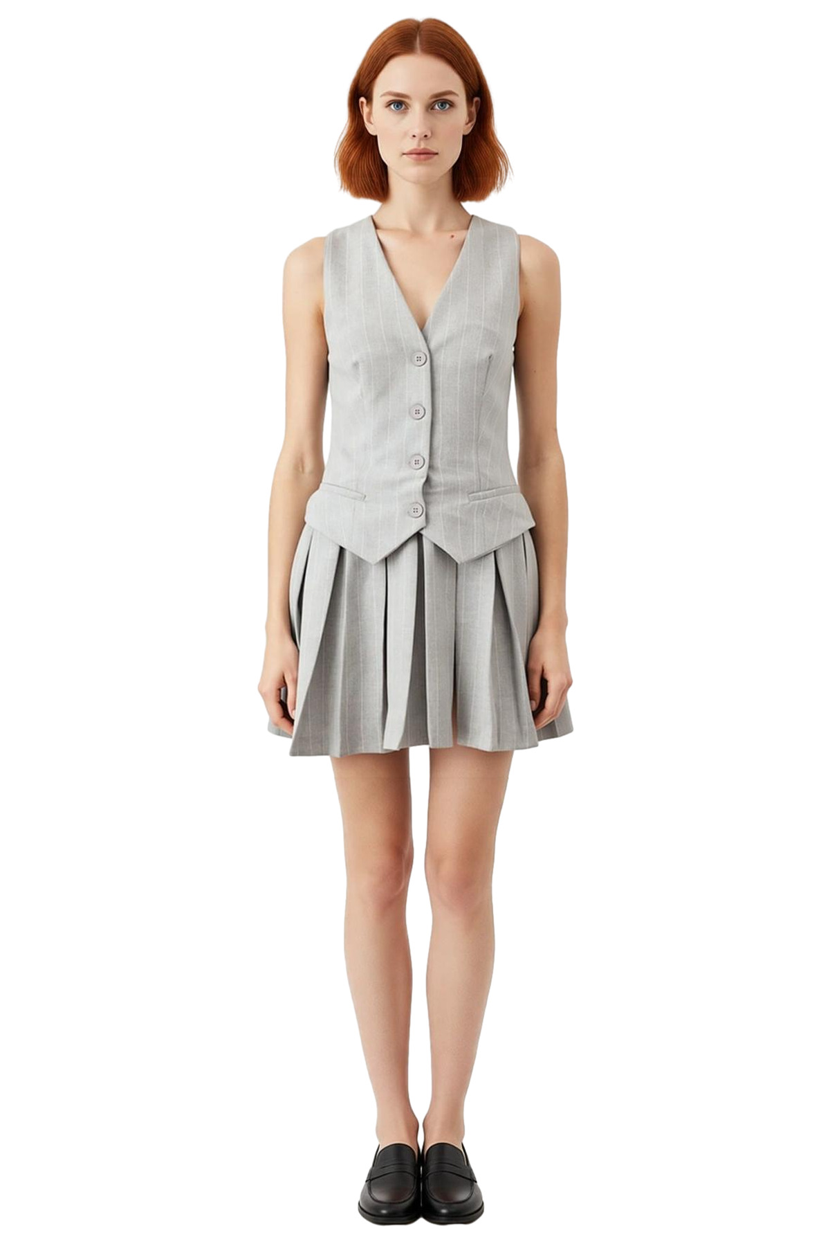 Ürün Özellikleri: Skater kalıp, poliviskon materyal, çizgili desen, v yaka, kolsuz kol, dokuma kumaş, gri renk, astarsız tasarım.