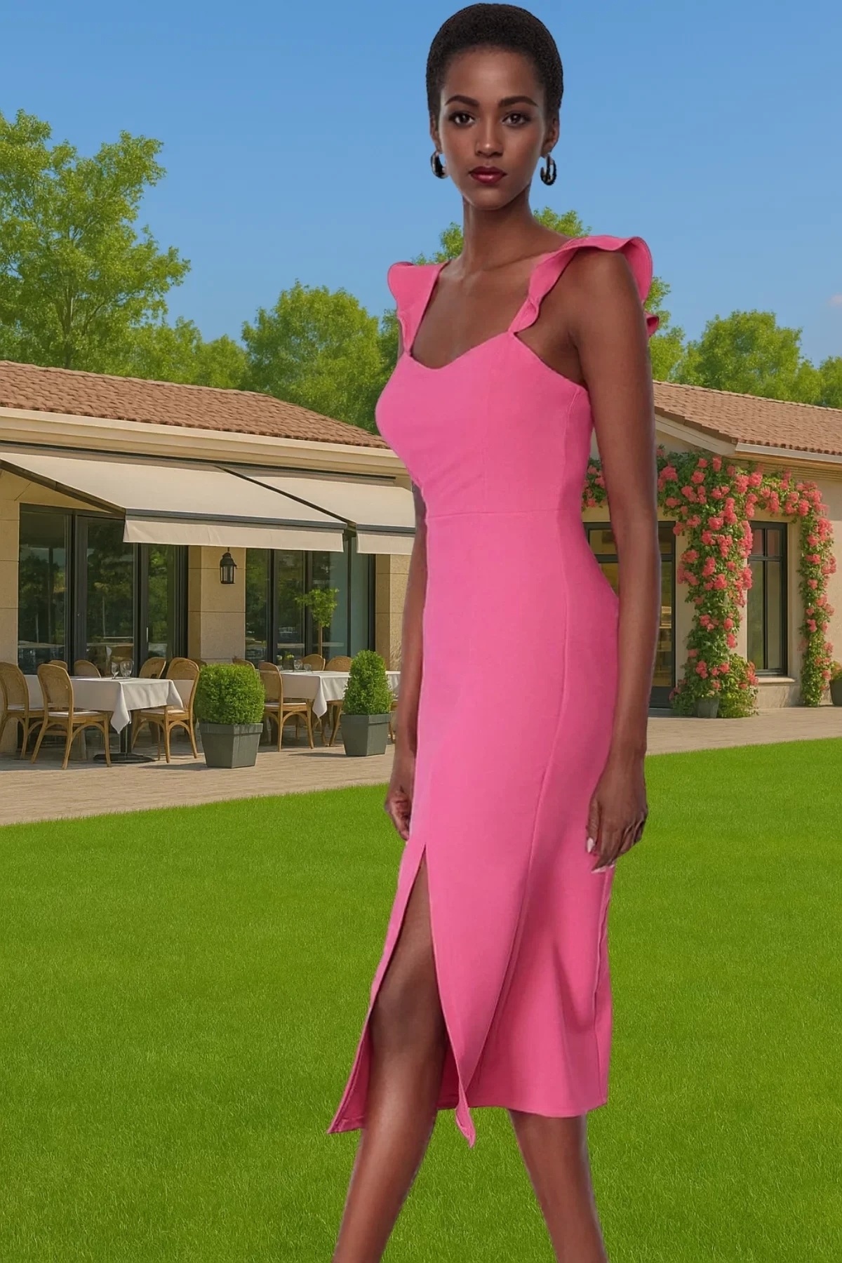 Yüksek kaliteli %88 polyester ve %12 elastan karışımından oluşan Finike dokuma kumaşı, nefes alabilir yapısıyla gün boyu rahatlık sağlar. Vücudu saran kesimi, vücut hatlarınızı zarifçe sergilerken, midi boyu her ortama uygun bir şıklık sunar. Standart kol tasarımı ve fırfırlı omuz detaylarıyla hem rahat hem de şık görünmenizi sağlayacak olan bu elbise, özel günlerinizi unutulmaz kılacak.