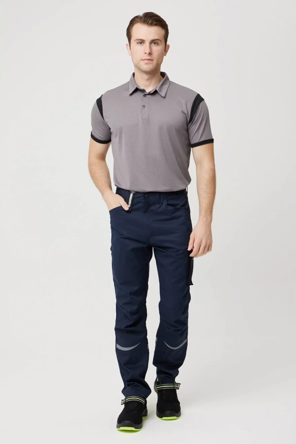 Gri renkli pantolon, çoklu cepleri ve fonksiyonel detaylarıyla işlevselliği ön plana çıkarır. Komando stili cep, kumpas cep ve kapaklı arka cepler, ihtiyaç duyduğunuz her şeyi güvenli ve erişilebilir şekilde taşımanızı sağlar. Modern reflektif bantlar ise düşük ışık koşullarında görünürlüğü artırır.
