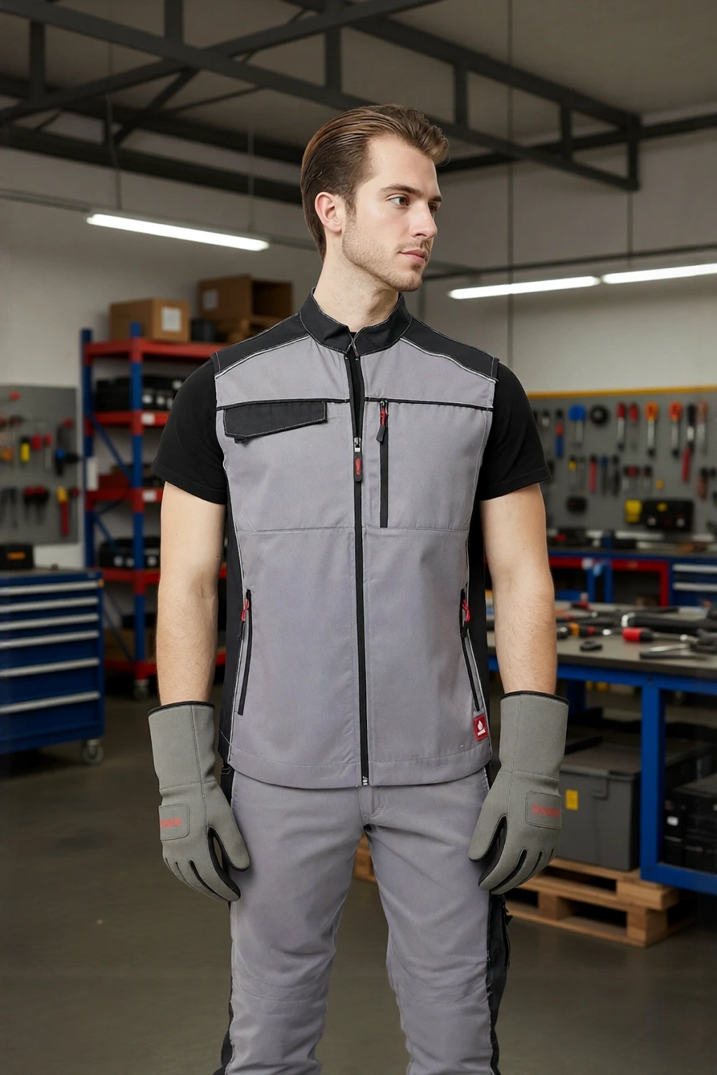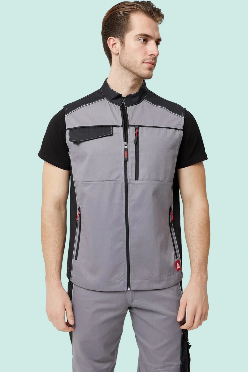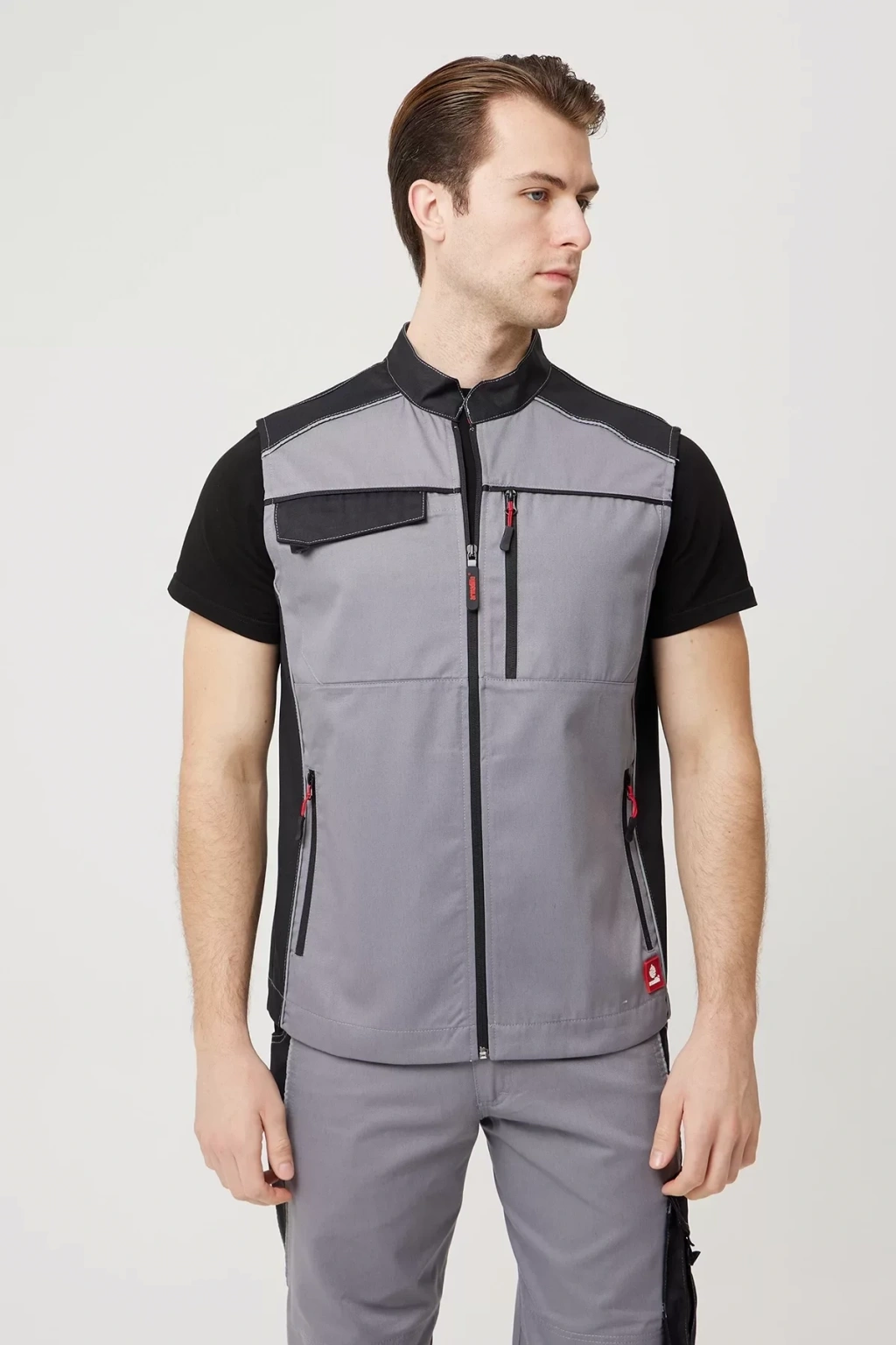 Armadillo marka, yaz aylarında kullanım için ideal, gri ve beyaz renk kombinasyonlu, şık ve fonksiyonel bir iş yeleği. Polyester gabardin kumaştan üretilen yelek, dayanıklılığı ve nefes alabilirliği ile öne çıkıyor.