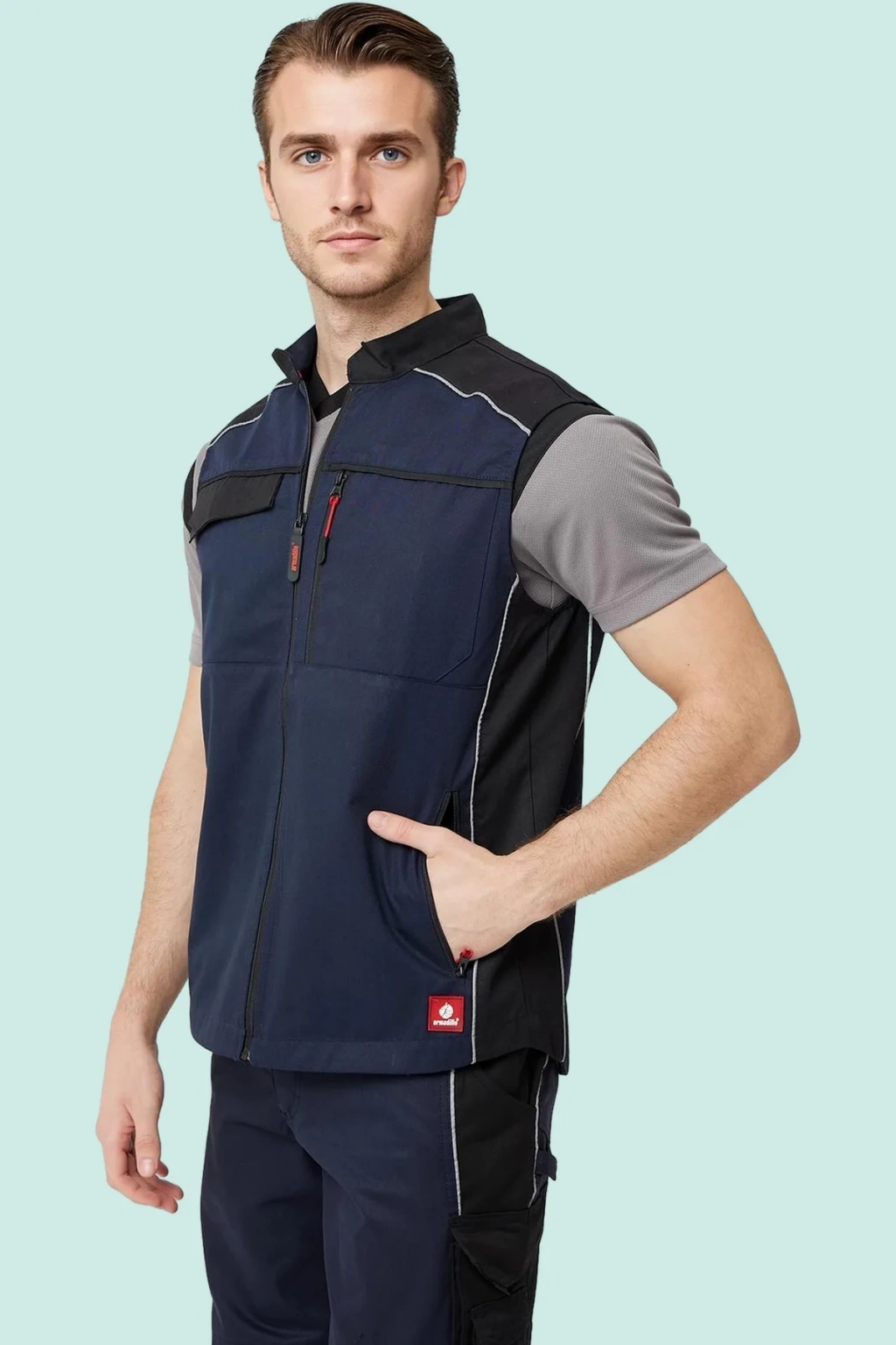 Armadillo marka, yaz aylarında kullanım için ideal, gri ve beyaz renk kombinasyonlu, şık ve fonksiyonel bir iş yeleği. Polyester gabardin kumaştan üretilen yelek, dayanıklılığı ve nefes alabilirliği ile öne çıkıyor.