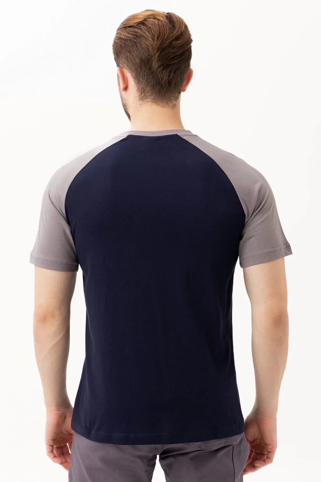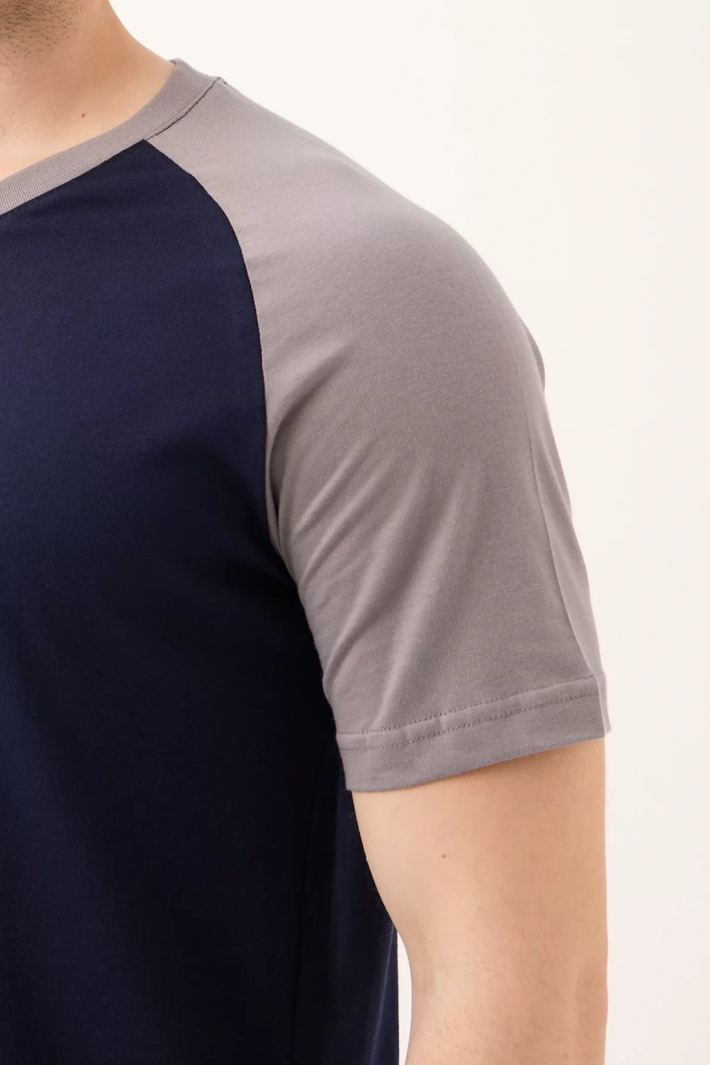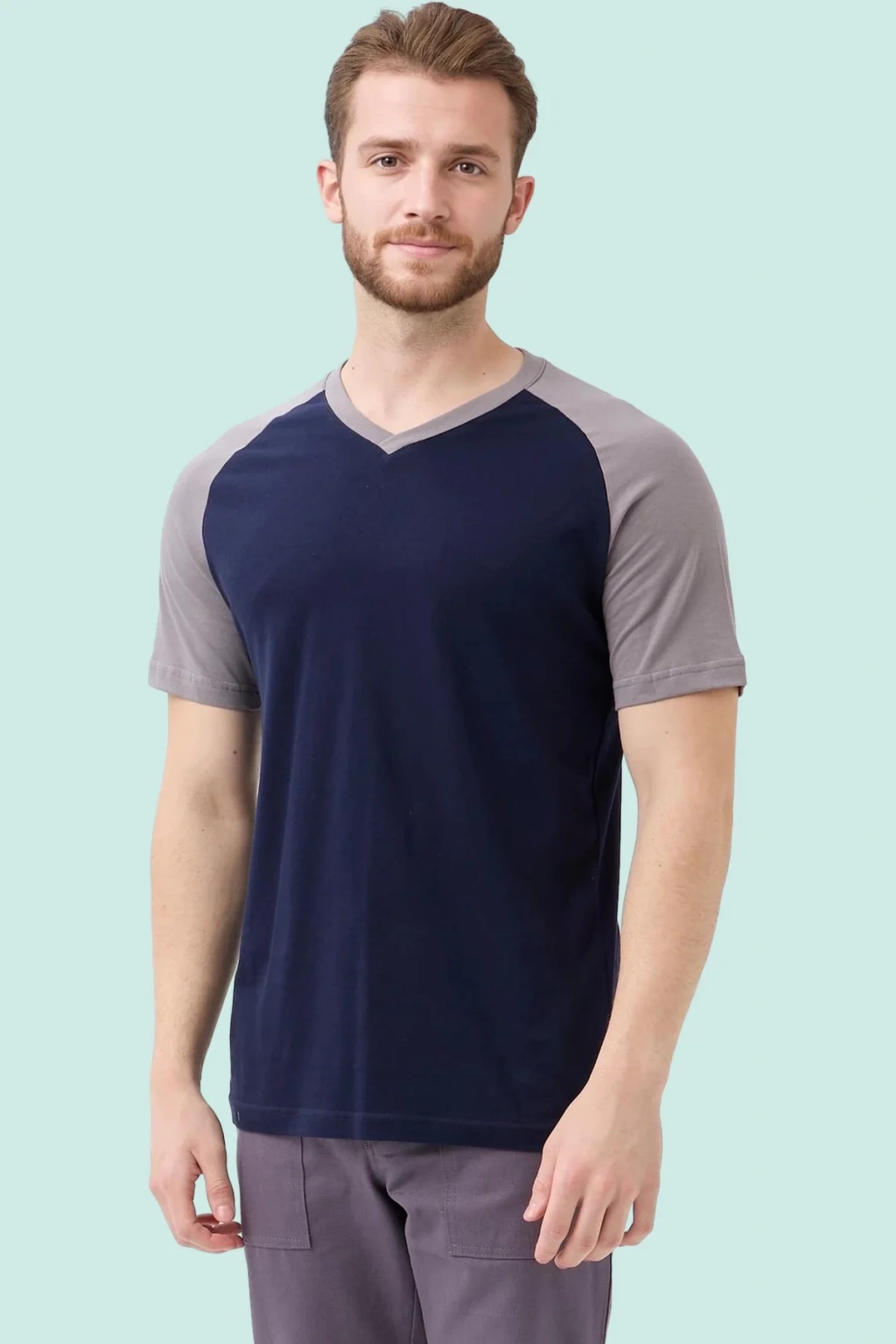 Gri ve lacivert renk kombinasyonu ile modern bir tarz sunan tişörtümüz, farklı pantolon ve alt giyim seçenekleriyle kombinlenebilir. Hem spor hem de casual bir görünüm yaratmak için idealdir. V yaka detayı, şık ve modern bir görünüm kazandırır.