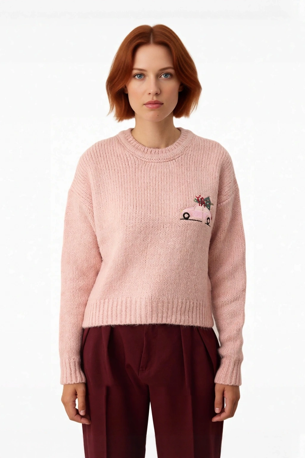 Bayanlara özel tasarlanan bu pembe triko kazak, nakış detaylı yılbaşı konseptiyle kış aylarına sıcak ve neşeli bir dokunuş katıyor. Regular kalıbı sayesinde her an rahat hissetmenizi sağlarken, 80% akrilik ve 20% polyester materyal bileşeni ile yumuşaklığı ve dayanıklılığı bir arada sunar. Orta kalınlıktaki yapısı, soğuk kış günlerinde sizi sıcacık tutarken stilinizden ödün vermez. Ön kısmındaki özenle işlenmiş yılbaşı deseni, bu kazağı benzersiz kılarak her kombinle uyum içinde şık bir görünüm sergilemenizi sağlar. Modern ve eğlenceli bir parça arayan kadınlar için ideal bir tercihtir.