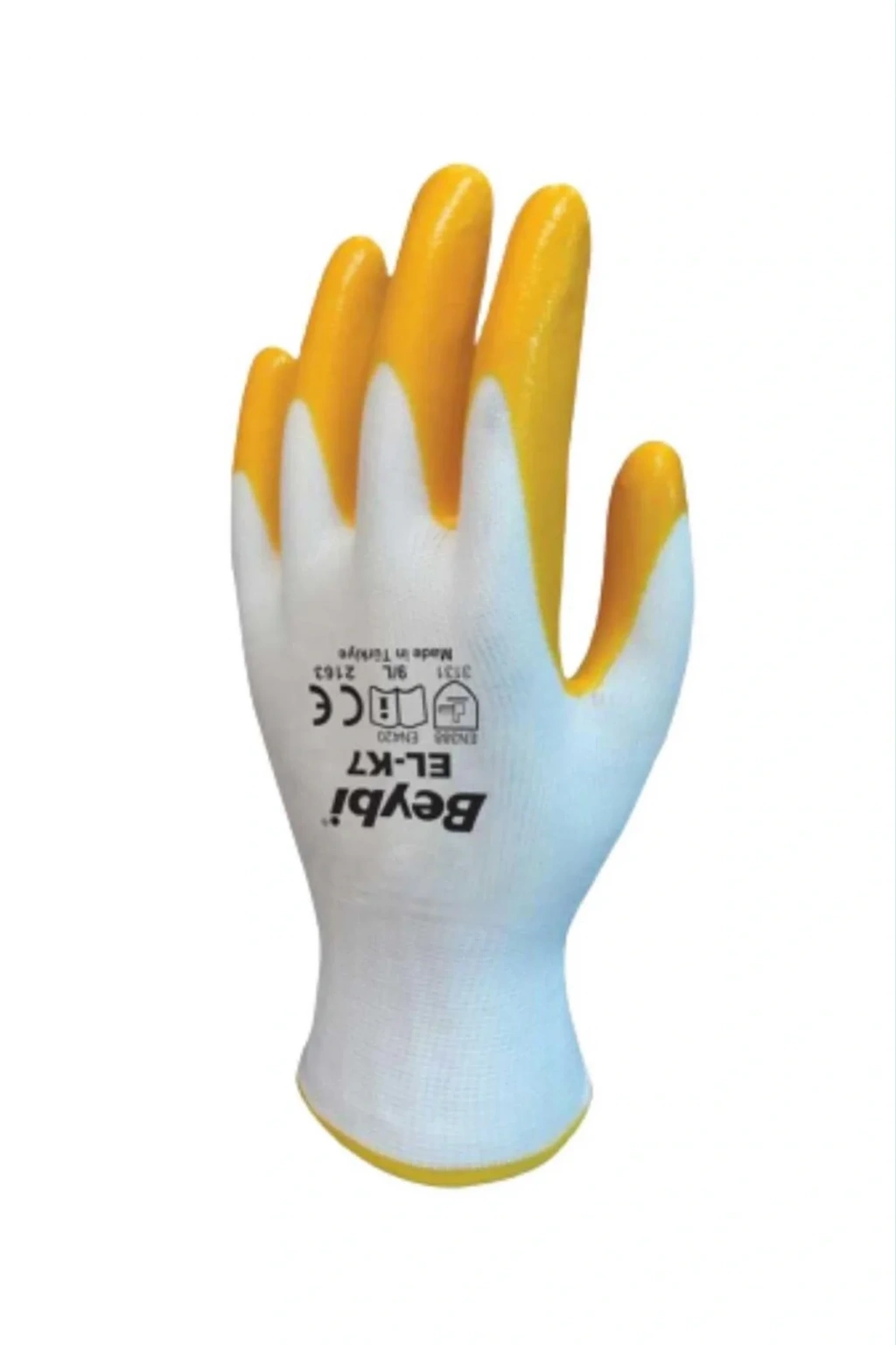 Beybi marka ELK-7 model nitril kaplamalı iş eldivenleri, üstün kalite ve performans sunan güvenilir bir iş güvenliği ürünüdür. Sarı ve beyaz renk kombinasyonu ile şık ve dikkat çekici bir tasarıma sahiptir.