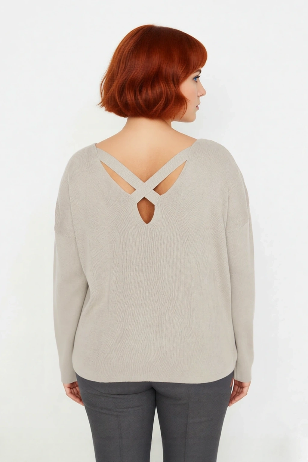 Ürün Özellikleri: Relaxed kalıp, %100 akrilik materyal, düz desen, bisiklet yaka, düşük kol, triko kumaş, bej renk, baskısız tasarım.