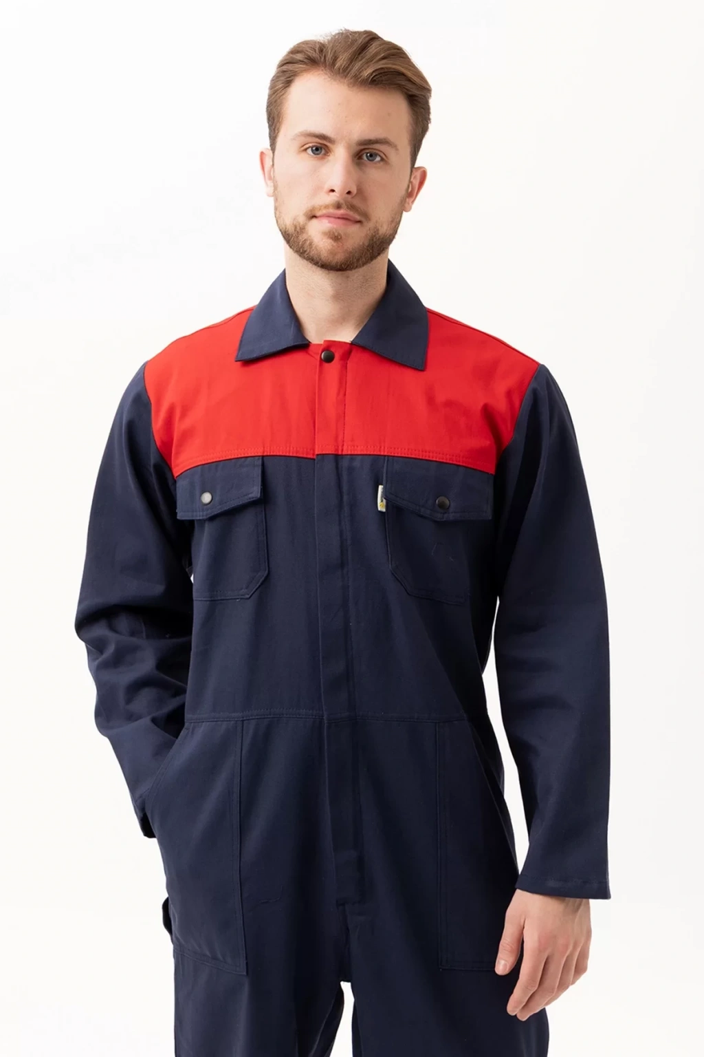 Lacivert ve kırmızı renklerin şık birleşimini sunan, %100 pamuklu gabardin kumaştan üretilen bu tulum, iş güvenliği ve konforu bir araya getiriyor. Ergonomik tasarımı sayesinde gün boyu rahat hareket imkanı sunar. Nefes alabilen yapısıyla sıcak havalarda bile terletmez.