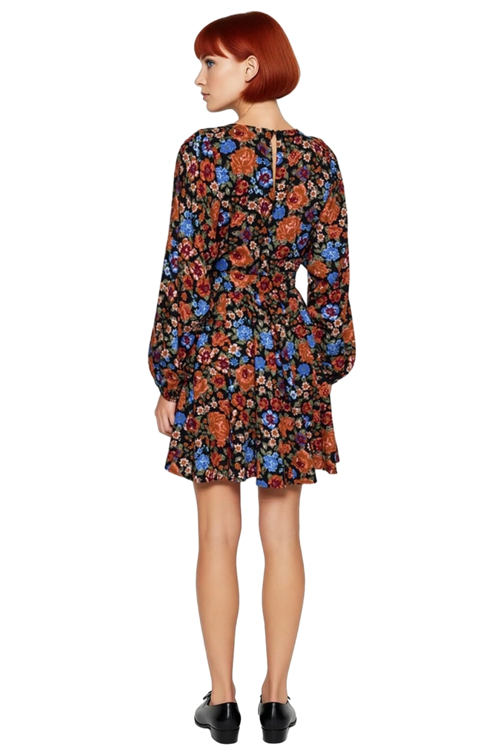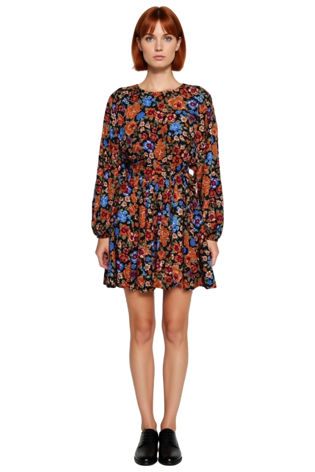Ürün Özellikleri: Skater kalıp, viskoz materyal, çiçekli desen, bisiklet yaka, uzun kol, dokuma kumaş, çok renkli, kuşaklı kapama.