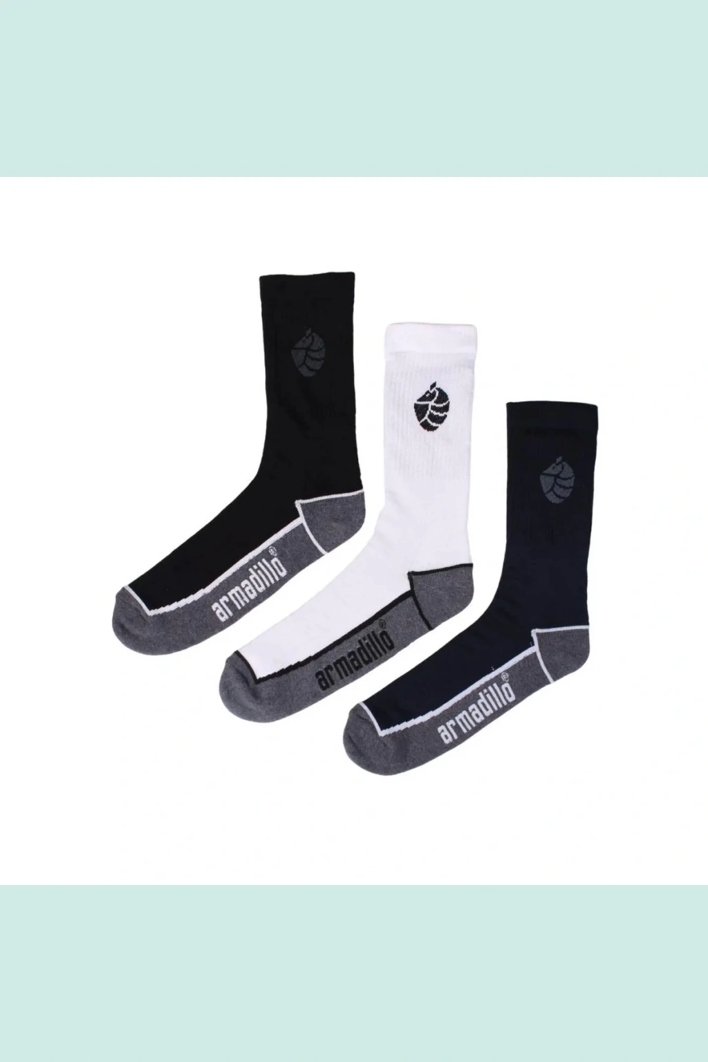 Paket içerisinde; 1 adet siyah, 1 adet beyaz ve 1 adet lacivert olmak üzere toplam 3 adet çorap bulunmaktadır. Her çorabın bileğinde Armadillo logosu bulunmaktadır. Çoraplar %80 pamuk, %17 polyester ve %3 elastan karışımından üretilmiştir.