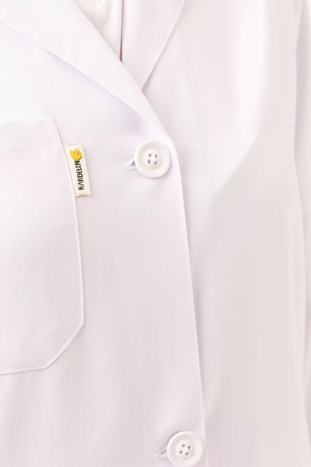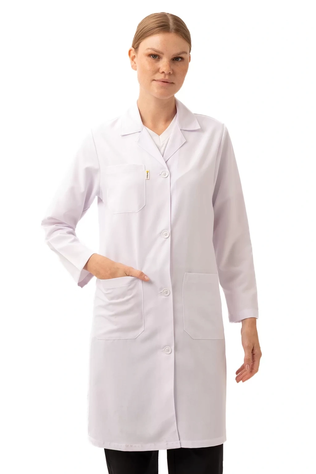 Sağlık çalışanları ve laboratuvar teknisyenleri için ideal olan beyaz kadın tıp önlüğü, şıklığı ve işlevselliği bir araya getiriyor. Uzun kollu ve diz boyu kesimiyle rahat hareket imkanı sunarken, aynı zamanda profesyonel bir görünüm sağlıyor.