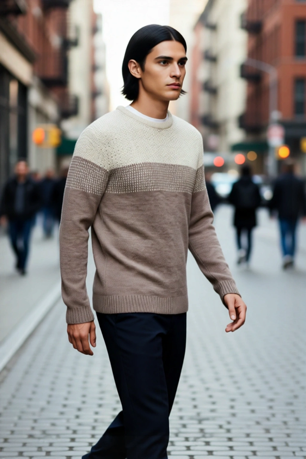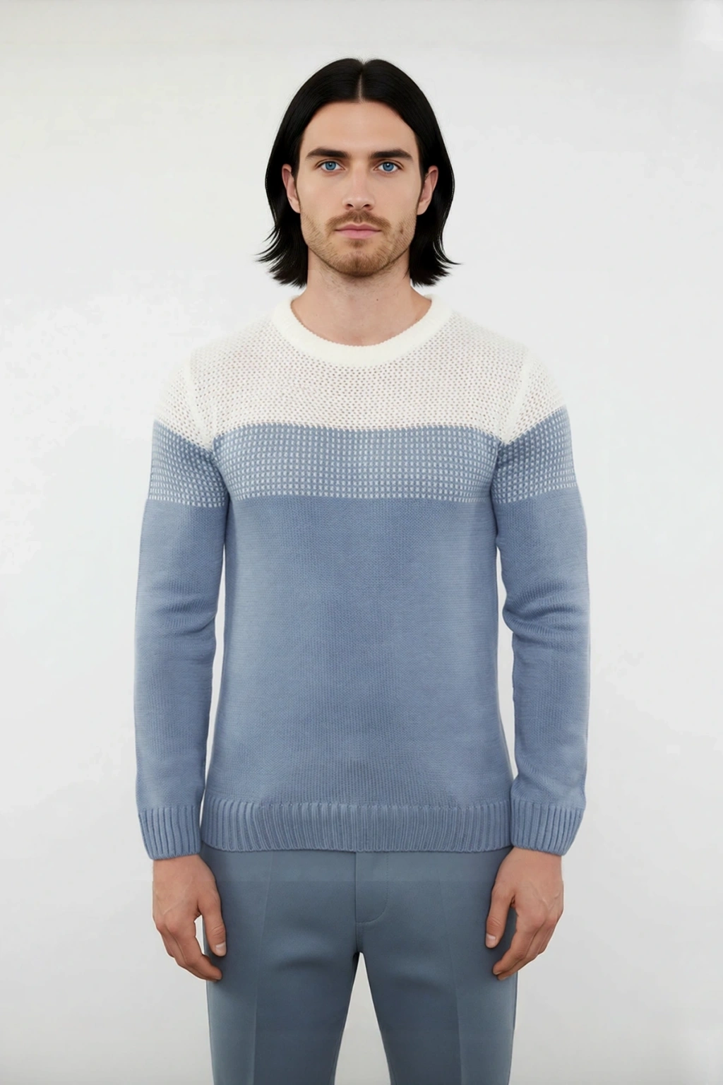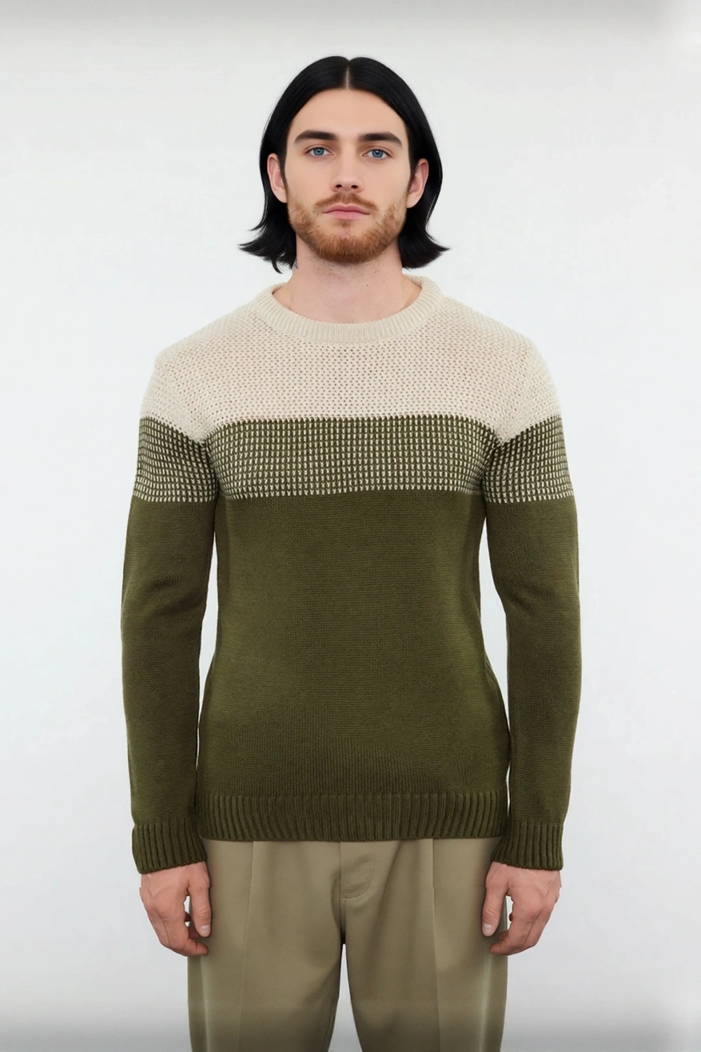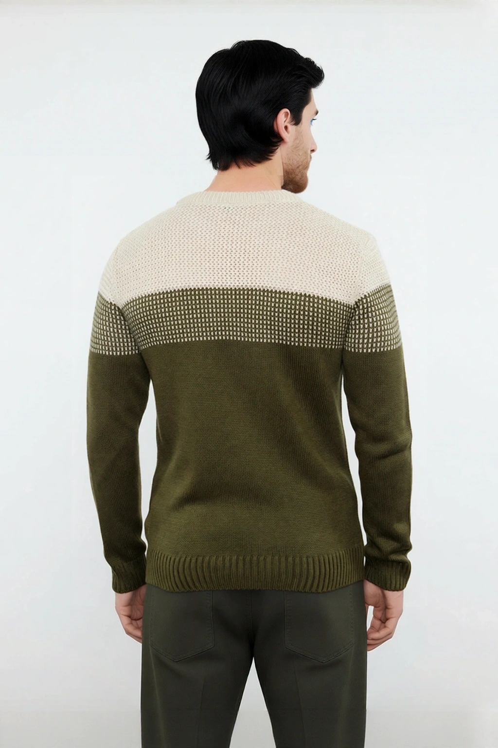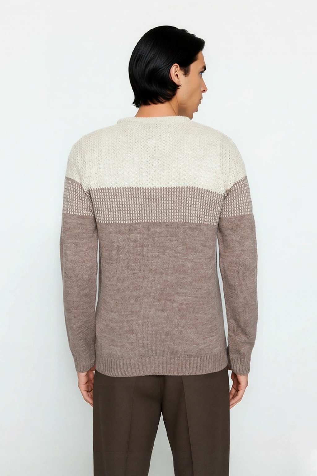 Erkek Basic Kesim Bisiklet Yaka Kazak, rahatlığı ve şıklığı bir arada sunan renk bloklu tasarımıyla dikkat çeker. %100 akrilik materyali sayesinde soğuk havalarda vücudunuzu sıcacık tutarken, yumuşacık dokusuyla gün boyu konfor sağlar. Bej ve kahve tonlarındaki renk blokları, modern ve dinamik bir görünüm yaratır. Baskısız ve düz yapısıyla her tarza kolayca uyum sağlar, Cool & Comfort personasını benimseyen erkekler için ideal bir tercihtir. Casual ve günlük ortamlar için mükemmel bir seçim olan bu kazak, gardırobunuzun temel parçalarından biri olacak.