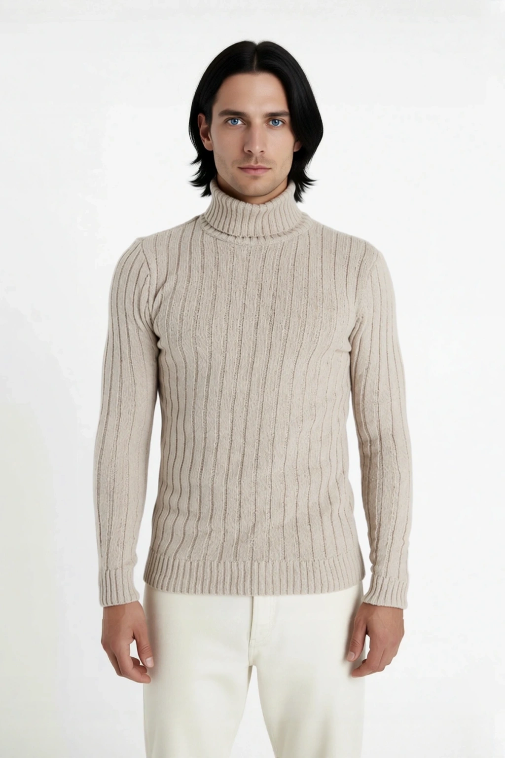 Ürün Özellikleri: Fitted kalıp, akrilik/polyester/viskoz/pamuk/yün materyal, fitilli desen, balıkçı yaka, uzun kol, triko kumaş, ekru renk, baskısız tasarım.