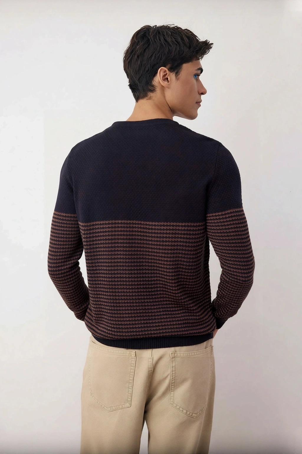 Ürün Özellikleri: Fitted kalıp, akrilik materyal, çizgili desen, bisiklet yaka, standart kol, triko kumaş, lacivert renk, cepsiz, uzun kol boyu, basic siluet, regular boy, baskısız tasarım.