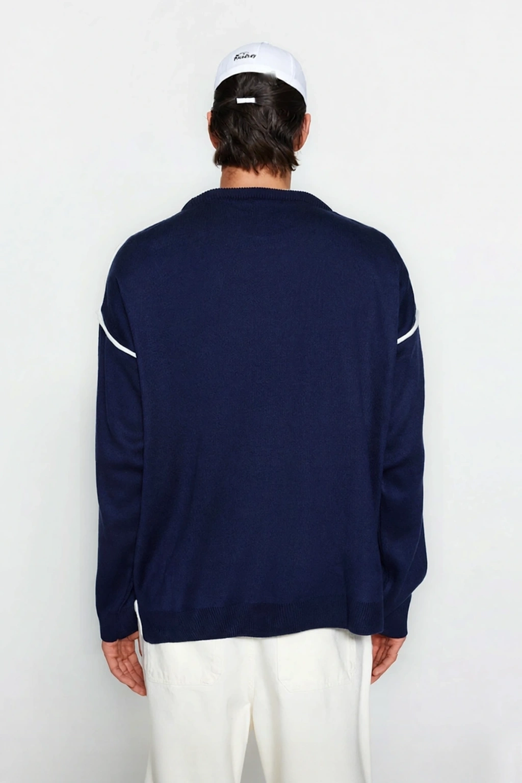 Ürün Özellikleri: Oversize kalıp, akrilik materyal, düz desen, bisiklet yaka, standart kol, triko kumaş, lacivert renk, baskısız tasarım.