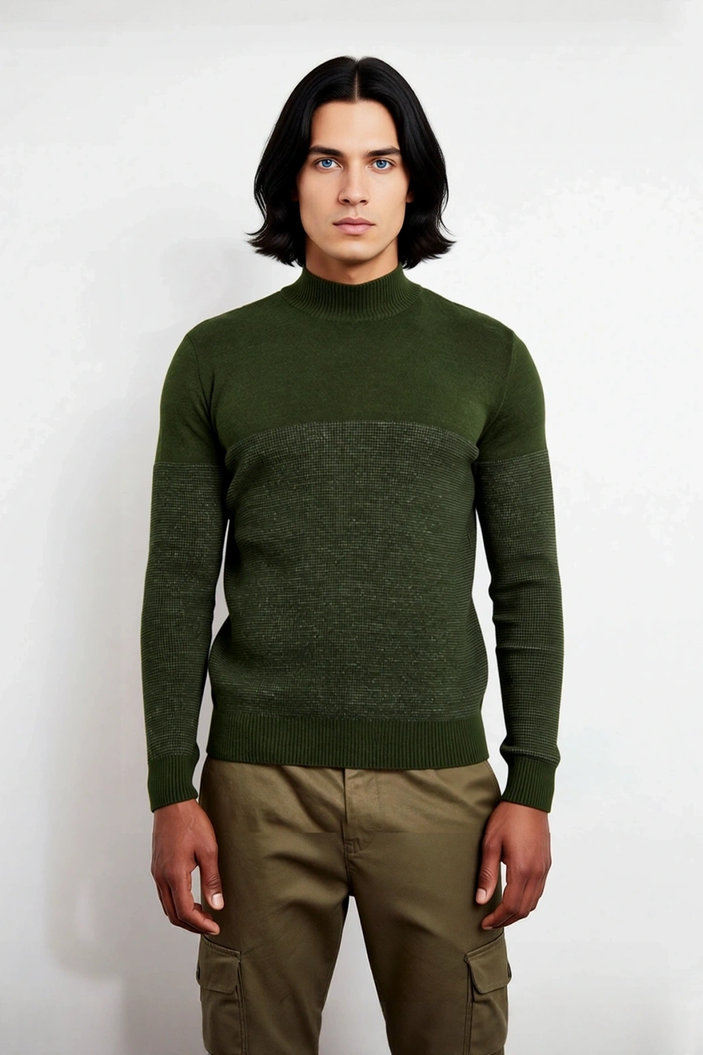 Bu erkek triko kazak, fitted kalıbı ile vücuda mükemmel uyum sağlayarak modern ve şık bir siluet oluşturur. Yüksek kaliteli akrilik, polyester ve yün karışımı materyali sayesinde soğuk havalarda bile sıcak tutar, aynı zamanda yumuşak ve konforlu bir dokunuş sunar. Haki rengi, doğal ve toprak tonlarıyla kolayca kombinlenebilirken, göğüs ve kol kısımlarındaki dokulu desen, tasarıma dinamik ve özgün bir hava katar. Baskısız ve cepsiz tasarımı, sade ve minimalist bir stil arayan erkekler için idealdir.